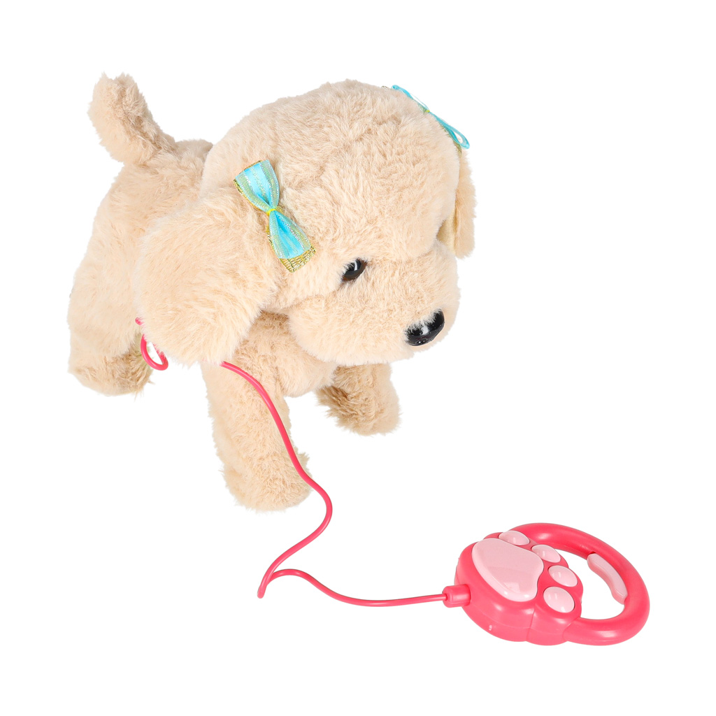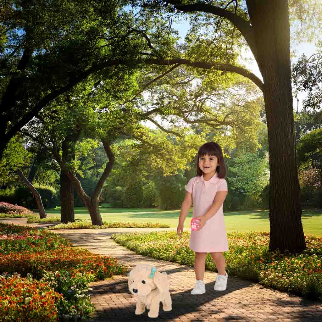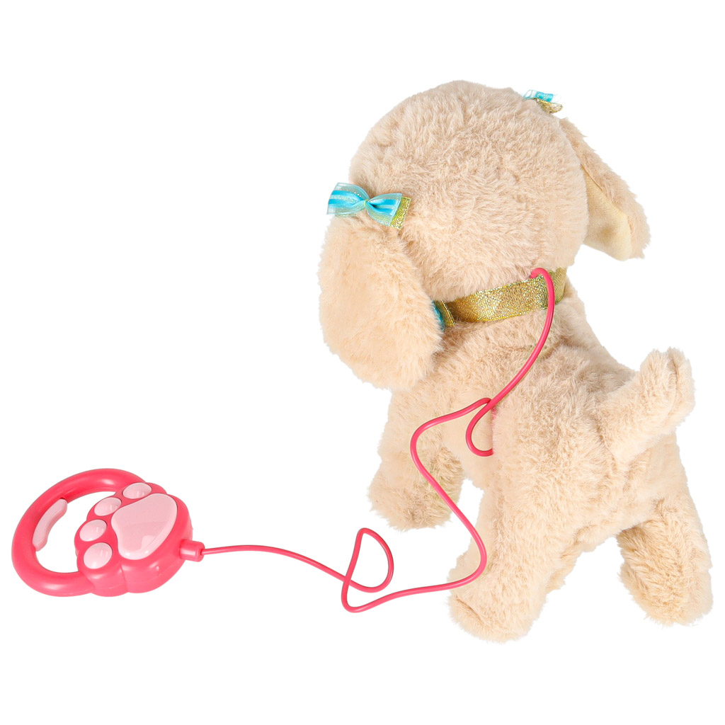 Ten uroczy piesek w kolorze beżowym z niebiesko-złotymi dodatkami to idealny towarzysz zabaw dla dzieci powyżej 3. roku życia. Dzięki różowej smyczy, maluchy mogą prowadzić swojego nowego przyjaciela wszędzie, gdzie tylko zechcą.