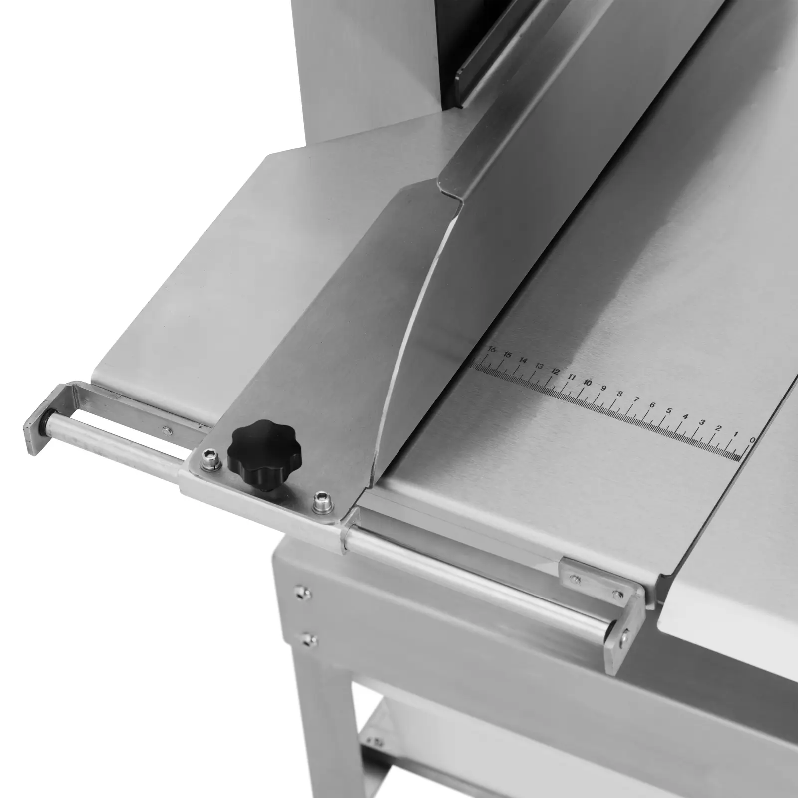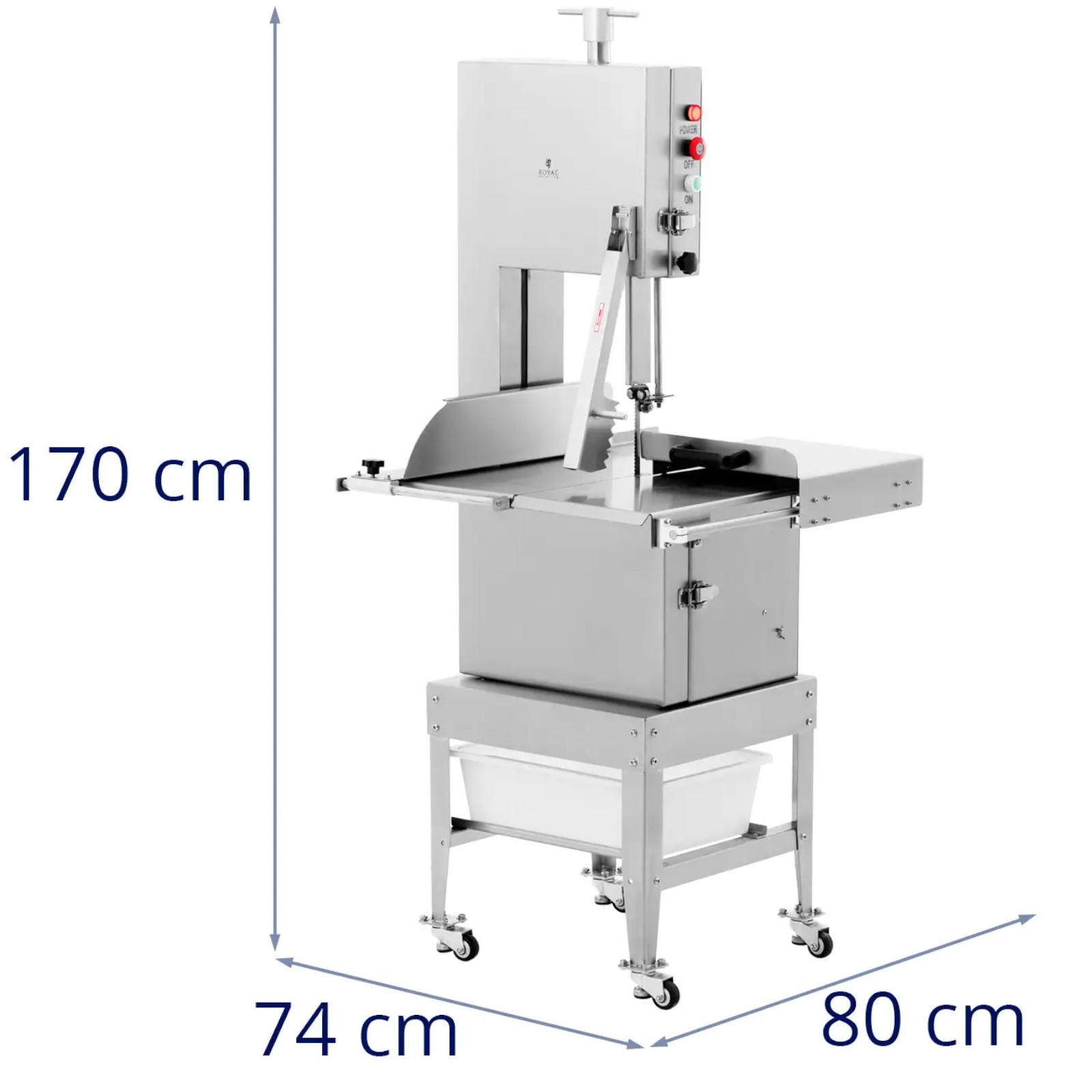 Piła ma maksymalną wysokość cięcia wynoszącą 330 mm, co pozwala na obróbkę dużych kawałków mięsa. Mobilność zapewniają cztery zintegrowane koła, a hamulce stabilizują urządzenie podczas pracy. Zintegrowany system przesuwny oraz powierzchnia robocza o wymiarach 78 x 74 cm zwiększają komfort użytkowania.