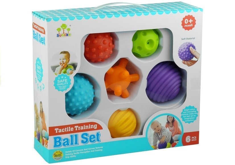 Prezentowany zestaw składa się z 6 różnych kul. Piłeczki posiadają wgłębienia i wypustki, dzięki czemu dziecko odkryje ogrom nowych wrażeń. Kształt zabawek sprzyja dodatkowej zabawie, jaką jest turlanie i rzucanie, co można połączyć z dozą aktywności fizycznej dla dziecka. Łapanie piłeczek usprawni umiejętność chwytania, natomiast kolory i ich faktury ułatwią zabawę w zapamiętywanie i odgadywanie, równocześnie rozwijając wyobraźnię.