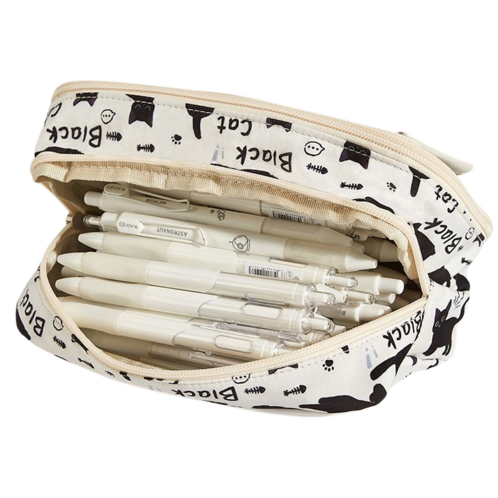 Pojemny i stylowy piórnik z motywem czarnych kotów to praktyczny i estetyczny dodatek dla uczniów, którzy cenią sobie porządek i oryginalny design. Wyróżnia się zabawnym nadrukiem z wizerunkami kotów w różnych pozach, co nadaje mu unikalnego charakteru i z pewnością przyciąga wzrok.
