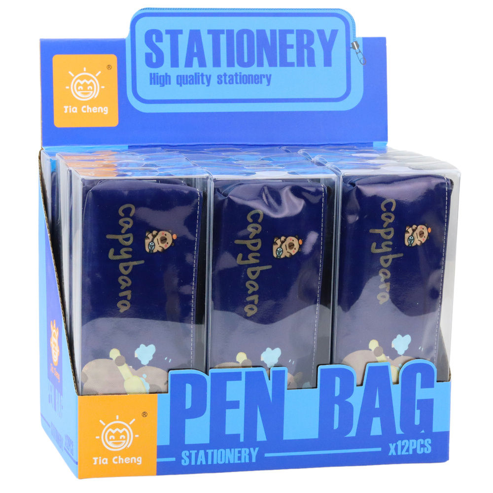 Ciemnogranatowy piórnik z błyszczącym wykończeniem i zabawnym motywem kapibary myjącej zęby to znakomity wybór dla dzieci, które uwielbiają nietuzinkowe dodatki szkolne. Ilustracja przedstawia sympatyczną kapibarę w codziennej czynności higienicznej, co nie tylko dodaje piórnikowi uroku, ale również może pozytywnie wpływać na promowanie zdrowych nawyków u najmłodszych.