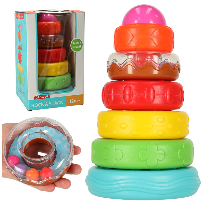 Wieża składa się z siedmiu dużych klocków, które można układać jeden na drugim, tworząc imponującą piramidę. Każdy klocek ma inny kolor i fakturę, co stymuluje zmysły malucha. Jeden z elementów zawiera kuleczki, które są widoczne przez przezroczystą górę.