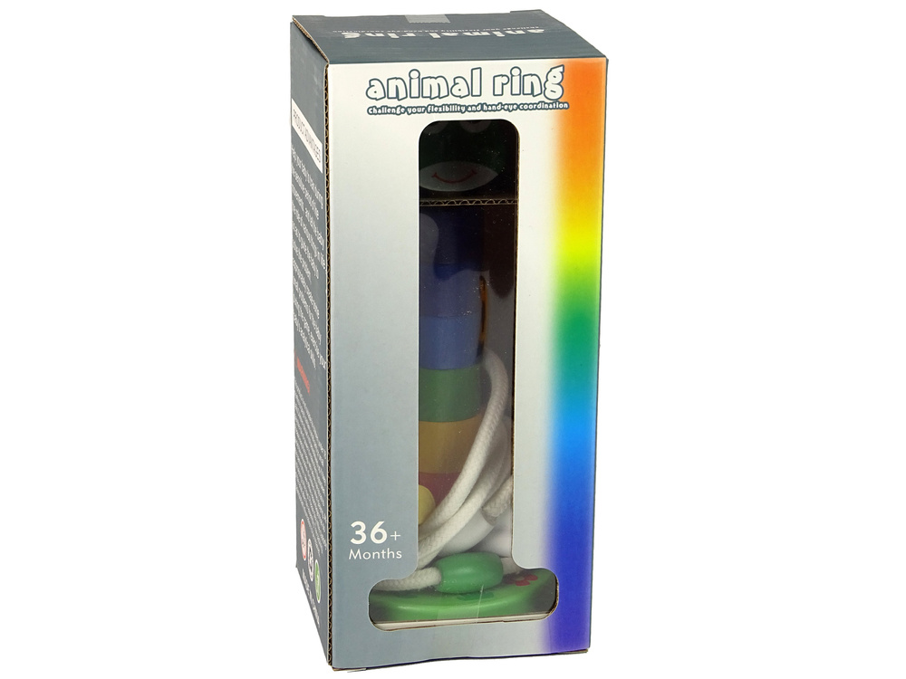 Zestaw klocków posiada podstawkę i klocki w różnych kolorach, co stymuluje zmysł wzroku malucha. Na samym szczycie znajduje się główka słodkiej żabki lub pandy, do wyboru jeszcze trzy inne wzory. W podstawie umieszczony jest bolec do nakładania elementów. Twój maluch może układać wieże według kolorów, może uda mu się ich nauczyć. Sznurki również posiadają różne kolorystycznie łączenia. Układanka daje możliwość wielu konfiguracji, wpływając przy tym na wyobraźnie dziecka.