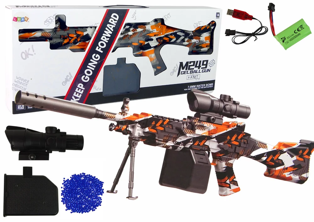 Karabin AMT na kulki wodne żelowe to interaktywna zabawka, która dostarczy wiele godzin zabawy i rozrywki. Jest to model o imponującej długości całkowitej wynoszącej aż 73 cm, co nadaje mu realistyczną i imponującą estetykę. Co więcej, pistolet jest ozdobiony kolorowym wzorem pomarańczowo - czarnym z dodatkiem białego koloru, co nadaje mu atrakcyjnego wyglądu. Pistolet jest zasilany dwoma akumulatorkami, co sprawia, że jest wygodny w użytkowaniu. Dzięki zastosowaniu akumulatorów nie trzeba martwić się o częste wymienianie baterii, co pozwala na dłuższą zabawę.