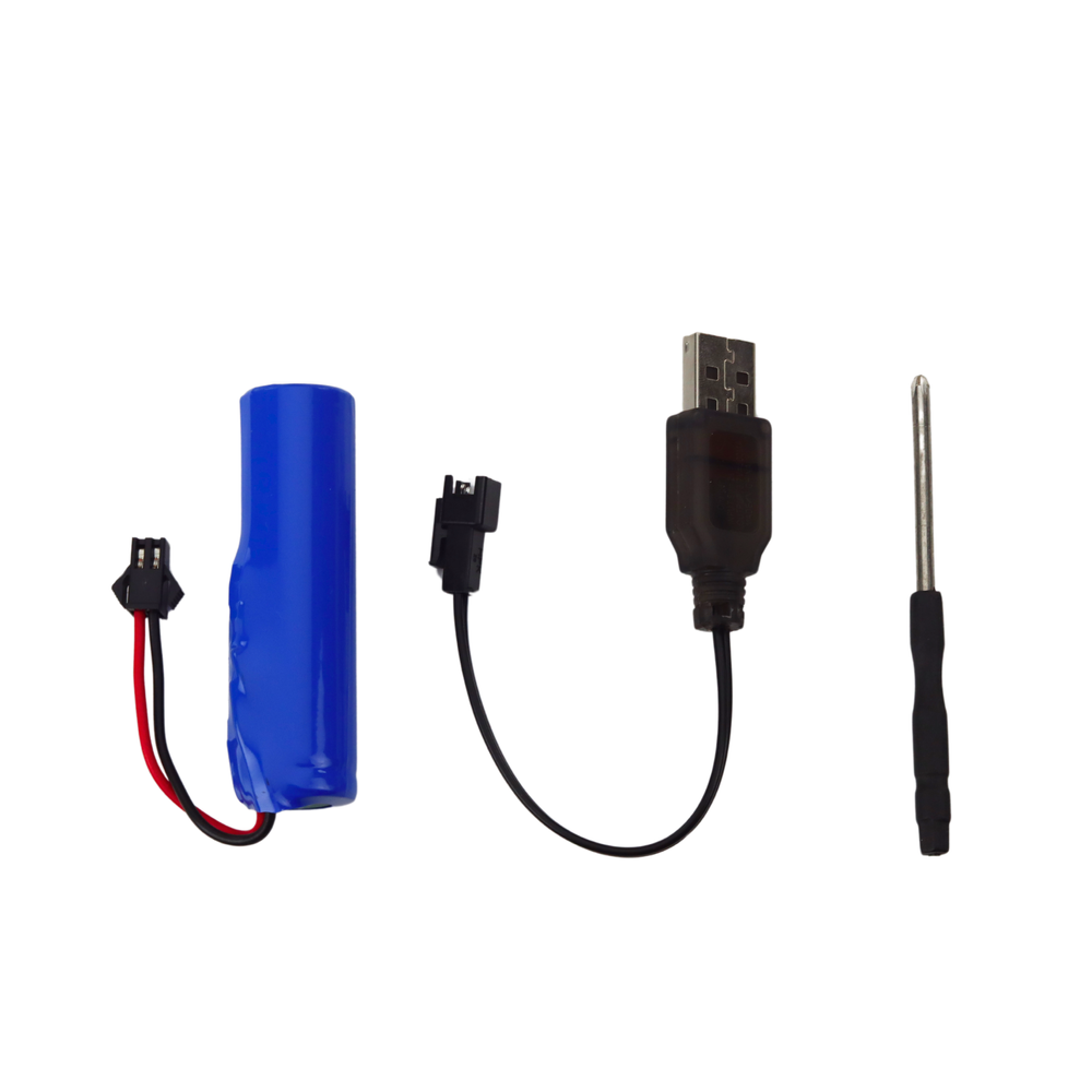 Pistolet zasilany jest akumulatorem 3.7V Li, który można w prosty sposób naładować za pomocą dołączonego kabla USB. Zestaw zawiera również śrubokręt, który umożliwia łatwy dostęp do komory baterii – wszystko, czego potrzeba, by rozpocząć zabawę od razu po rozpakowaniu.