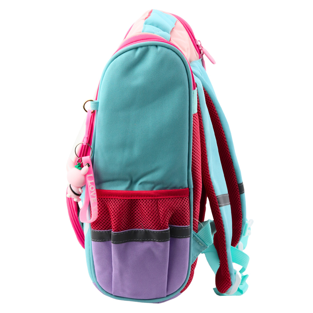 Plecak posiada jedną dużą komorę główną, która zapewnia wystarczająco dużo miejsca na książki, zeszyty i inne akcesoria szkolne. Z przodu znajduje się odpinana saszetka z ptaszkiem, którą można wykorzystać jako osobne etui lub ozdobę. Dodatkowo do suwaka przypięta jest zawieszka z uroczym króliczkiem.