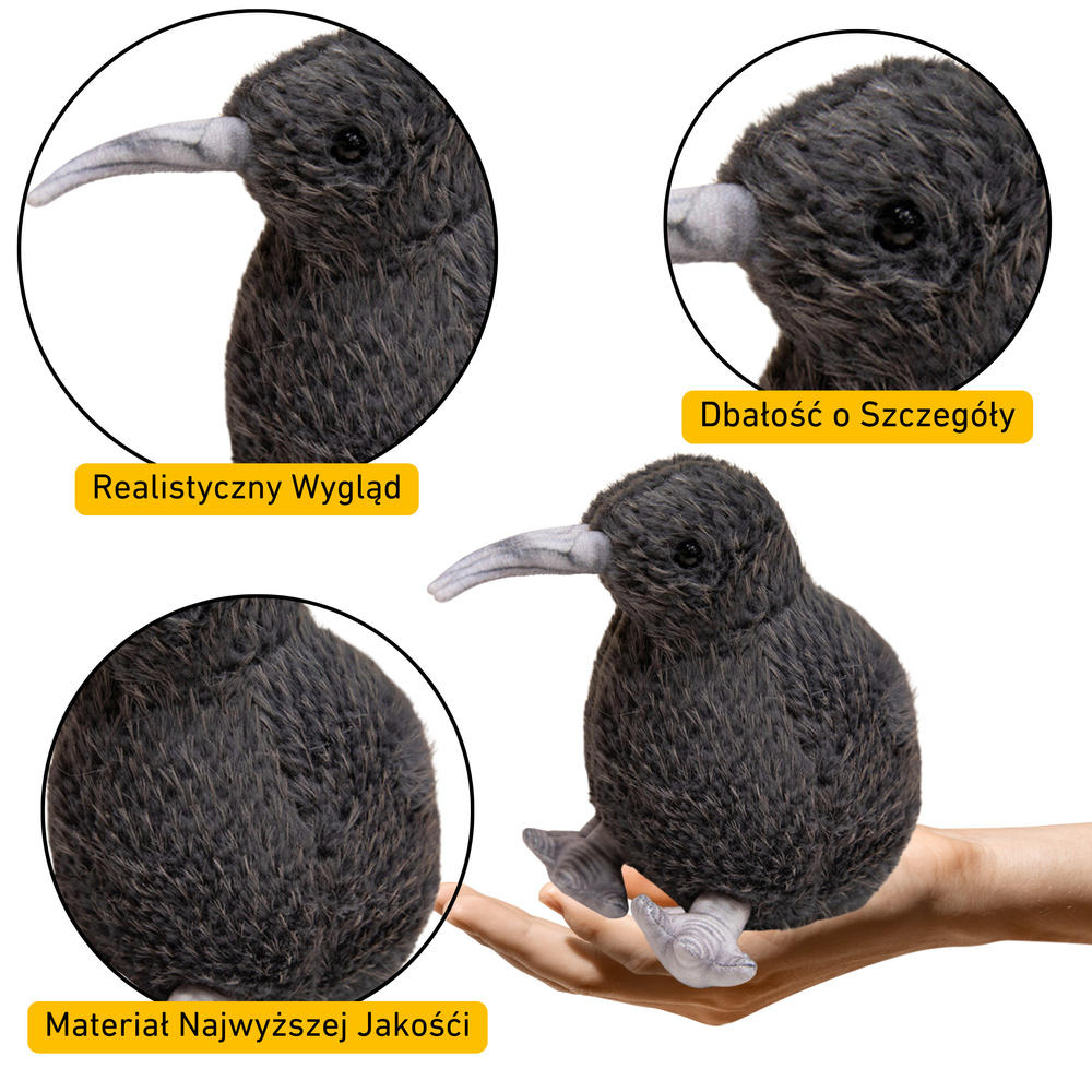 Pluszowa maskotka ptaka kiwi o wysokości 21 cm, wiernie oddającą charakterystyczne czarne upierzenie tego unikalnego ptaka. Wykonana z niezwykle miękkiego i przyjemnego w dotyku materiału, zapewnia wyjątkowy komfort podczas przytulania. Starannie dopracowane detale nadają jej autentyczny wygląd, co czyni ją idealnym towarzyszem zabaw oraz ozdobą pokoju dziecięcego.