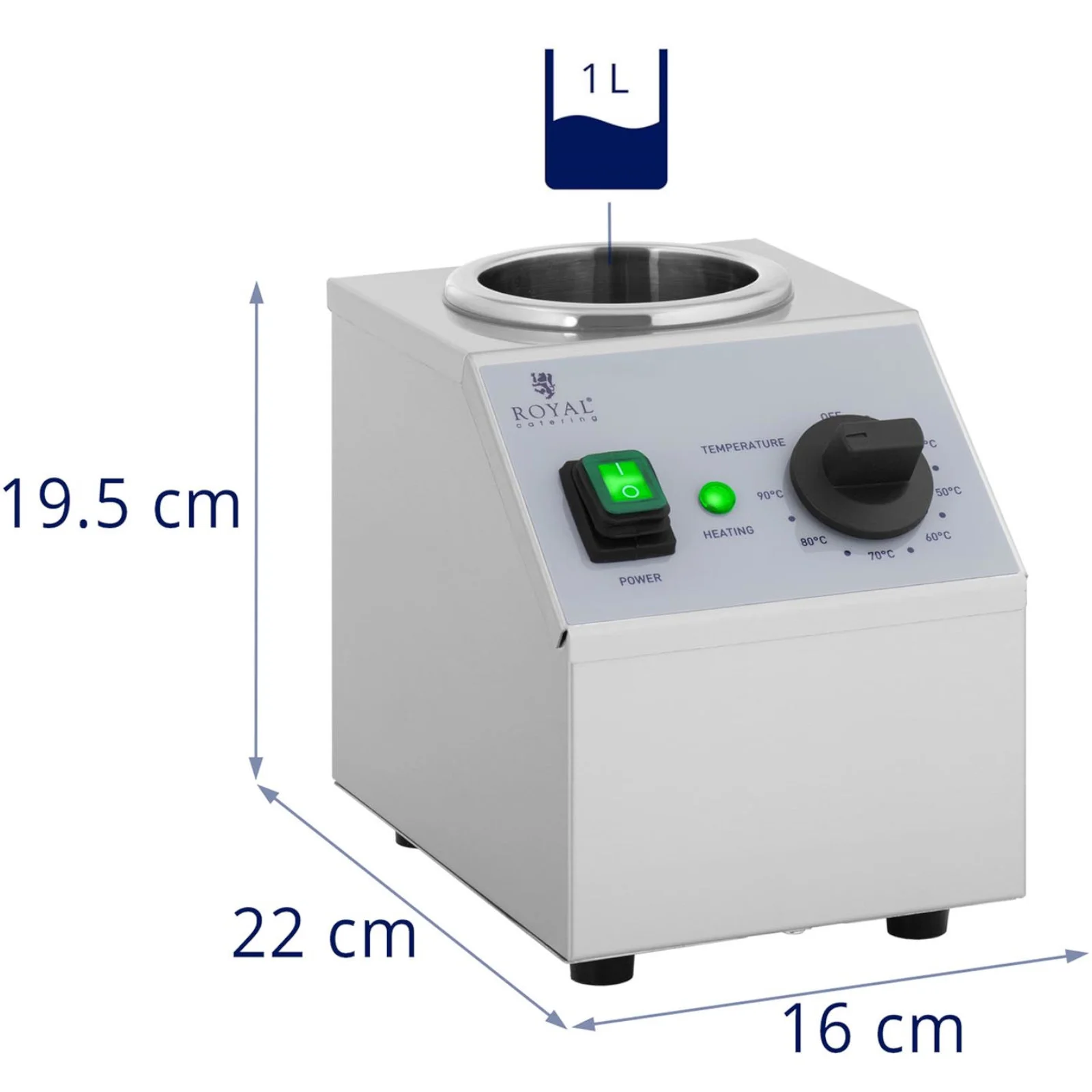 Podgrzewacz do butelek sosów na ciepło 1x1L 40-90°C 175W to doskonałe rozwiązanie dla każdego, kto pragnie serwować ciepłe sosy w atrakcyjny sposób. Urządzenie marki Royal Catering zapewnia, że sosy takie jak serowy, chilli czy barbecue będą zawsze w idealnej temperaturze. Dodatkowo, świetnie nadaje się do podgrzewania polew czekoladowych, co z pewnością uatrakcyjni Twoje desery.