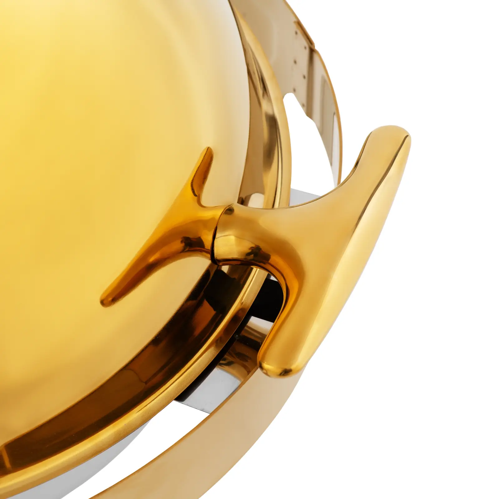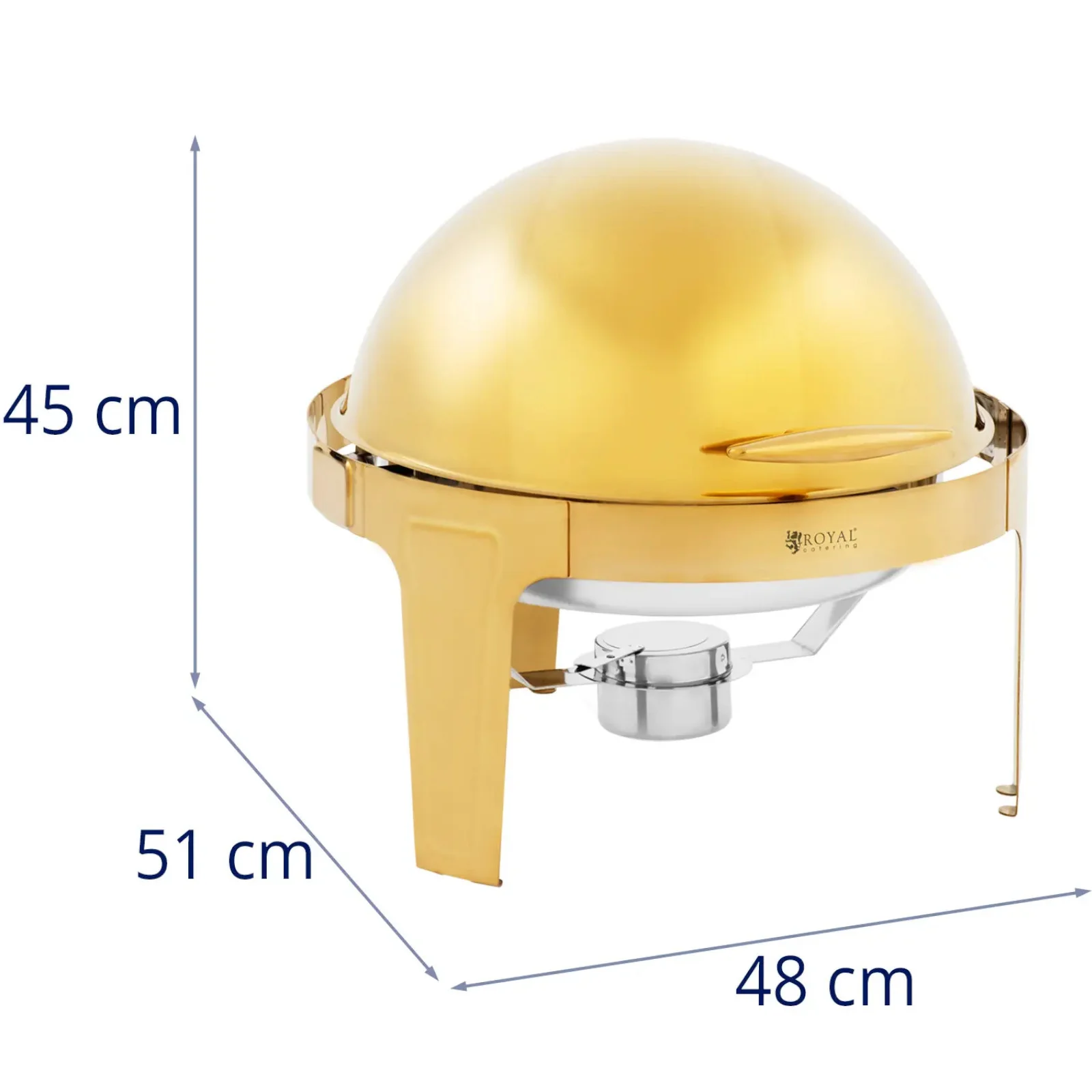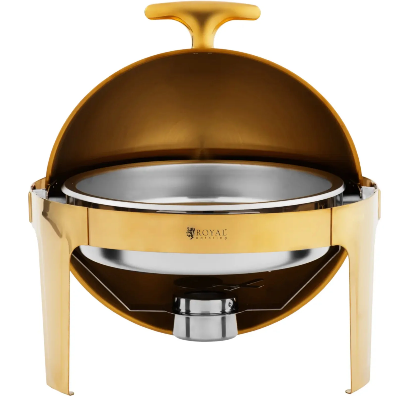 Podgrzewacz do potraw bufetowy na pastę okrągły 6 l - złoty od Royal Catering to wyjątkowe rozwiązanie, które sprawdzi się doskonale w hotelach, restauracjach oraz podczas różnorodnych bankietów. Utrzymuje nie tylko ciepło żywności, ale również estetycznie prezentuje różnorodne dania, dzięki swojemu kulistemu kształtowi i eleganckiemu złotemu wykończeniu.