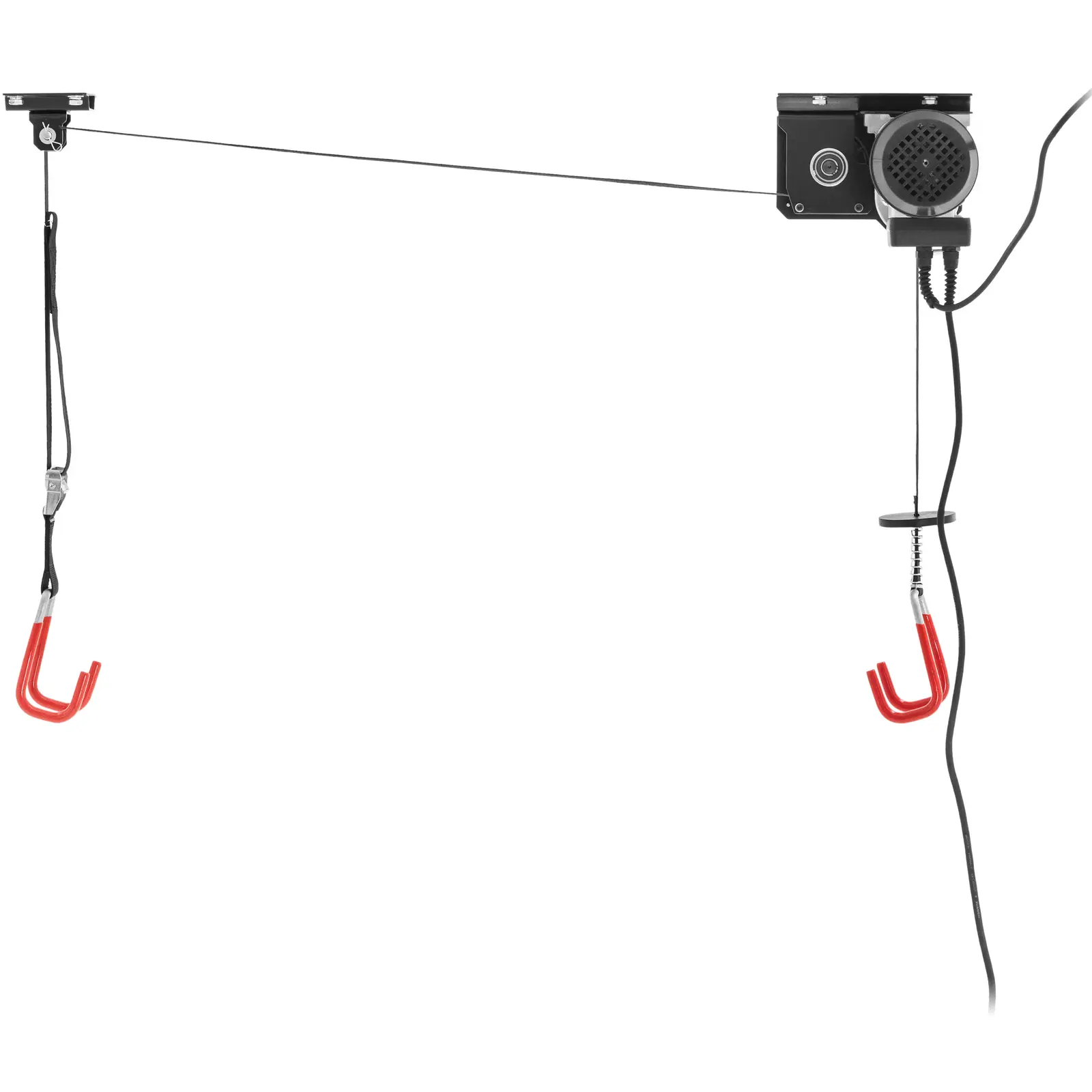 W zestawie znajdziesz elektryczny podnośnik rowerowy, który sprawi, że przechowywanie rowerów stanie się prostsze i bardziej komfortowe.