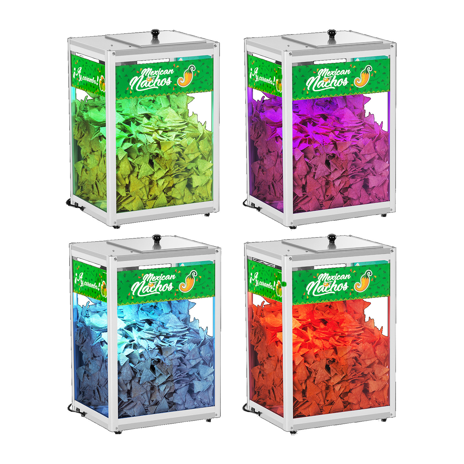 Podgrzewacz RCNW-1L to doskonałe rozwiązanie dla profesjonalnych lokali gastronomicznych. Umożliwia podgrzewanie różnorodnych przekąsek, takich jak nachos, orzeszki ziemne oraz popcorn. Dzięki zaawansowanej technologii RGB LED, oferuje aż 16 kolorów, co przyciąga uwagę klientów i tworzy atrakcyjną atmosferę.