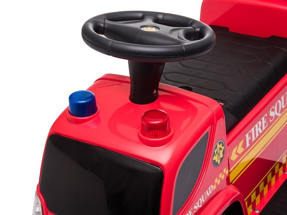 Wyglądem przypomina prawdziwą straż pożarną, dźwięki i światła zachęcą małego odkrywce do zabawy. Po podłączeniu akumulatora możemy traktować go jak prawdziwy pojazd. Podnóżki pozwolą na wygodne ułożenie nóg, a przycisk ze strzałkami umożliwi poruszanie się w przód bądź tył. Jazda równym podłożem będzie niesamowita. Jeszcze jedna dodatkowa funkcja w pojeździe zaskoczy każdego. Z tyłu drabiny znajduje się mała armatka, z której wylatują bąbelki. Wystarczy wlać płynu, nacisnąć przycisk i podziwiać jak bąbelki szybują w powietrze, które pięknie mienią się w różnych kolorach.