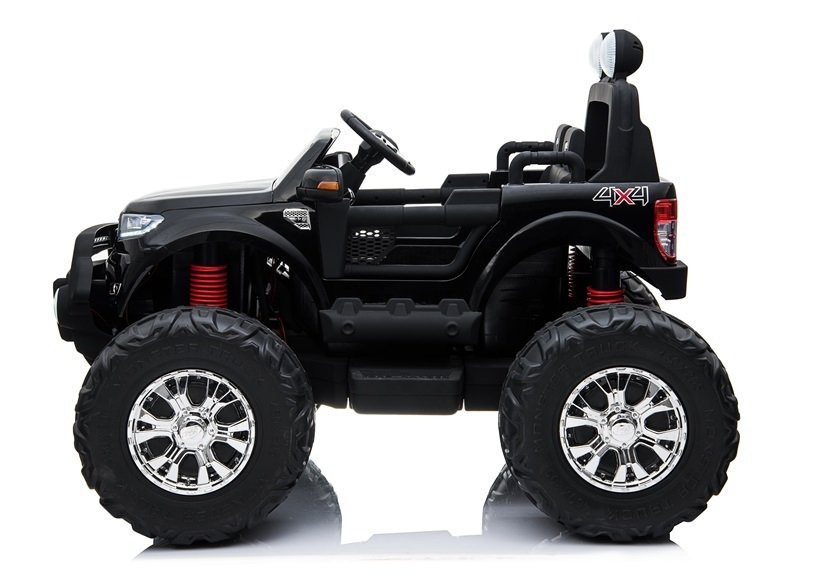 Czarna wersja Forda Monster Truck dla kilkuletnich kierowców posiada wszystko to, co jest wymagane do fantastycznej zabawy. Pierwsze, na co każdy przechodzień zwróci uwagę, jest potężna, silna konstrukcja — nie wymaga ona zbędnych zdobień i dodatków poza klasycznymi naklejkami, by przyciągnąć wzrok przechodniów. Monster Truck dla dzieci osadzony jest na wielkowymiarowych kołach o dużym rozstawie — średnica kół to około 43 cm, co z szerokością na 20 cm, a także wykonaniem ze specjalnego tworzywa sztucznego EVA, gwarantuje rewelacyjną jazdę po różnych nawierzchniach — pojazd ten z łatwością pokona nie tylko asfaltową drogę. By komfort zabawy był jeszcze większy, w budowie czarnego Forda uwzględniono cztery amortyzatory, odpowiadające za miękkość jazdy i prawidłowy kontakt kół z nawierzchnią.