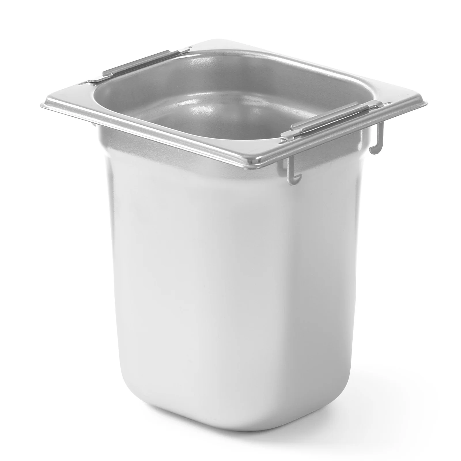 Pojemnik spełnia normy sanitarno-epidemiologiczne, co zapewnia bezpieczeństwo w kontakcie z żywnością. W zestawie znajduje się pojemnik GN z chowanymi uchwytami, co ułatwia jego przechowywanie i transport.