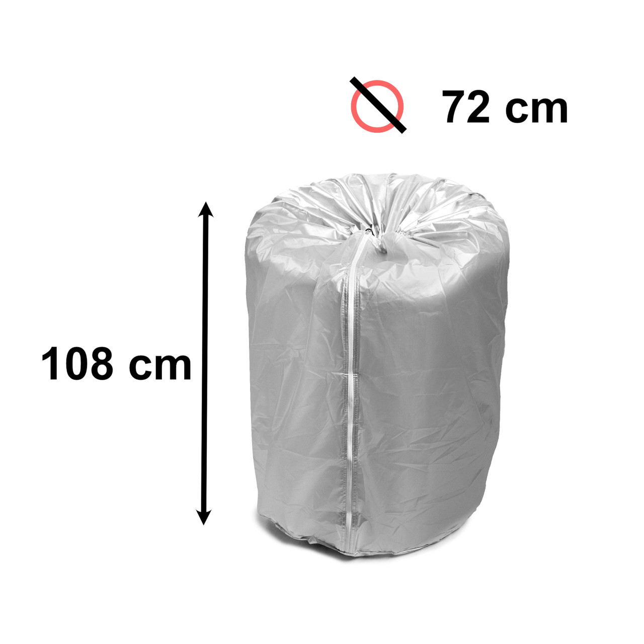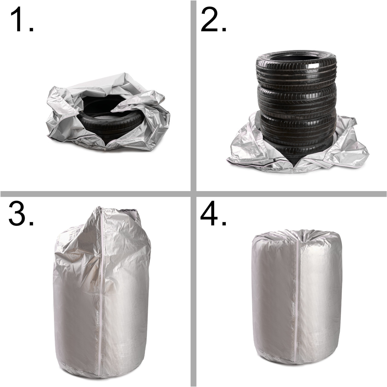 Pokrowiec pasuje do opon o średnicy od 13 do 17 cali, co czyni go uniwersalnym rozwiązaniem do większości pojazdów. Zamek błyskawiczny ułatwia zakładanie, a ściągacz pozwala na idealne dopasowanie pokrowca do opon, co zapewnia lepszą ochronę przed wilgocią i kurzem.