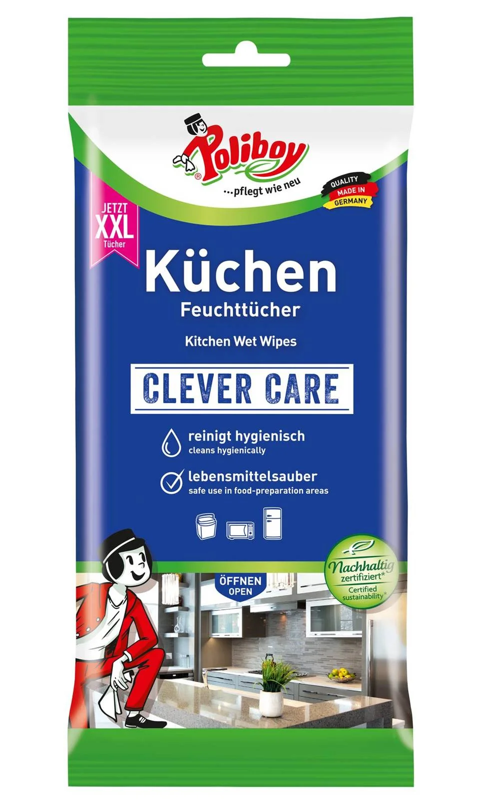 Chusteczki kuchenne Poliboy to idealne rozwiązanie do czyszczenia różnych powierzchni w kuchni. Świetnie sprawdzają się na lodówkach, kuchenkach mikrofalowych, zamrażarkach, koszach na śmieci oraz na blatach roboczych. Dzięki zawartości alkoholu, te chusteczki zapewniają higieniczną czystość oraz długotrwałą świeżość z przyjemnym zapachem pomarańczy.