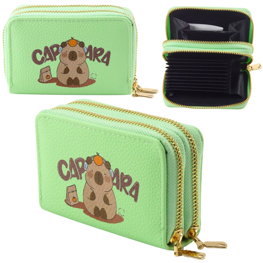 Zielony portfel z uroczym motywem kapibary to funkcjonalny i wygodny dodatek, który łączy kompaktowy rozmiar z dużą pojemnością. Wyposażony w dwie oddzielne komory zamykane na zamki błyskawiczne, zapewnia wygodne przechowywanie kart, banknotów, monet oraz innych niezbędnych drobiazgów. Dzięki harmonijkowej konstrukcji wewnętrznej portfel oferuje wiele przegródek, które ułatwiają porządkowanie zawartości.