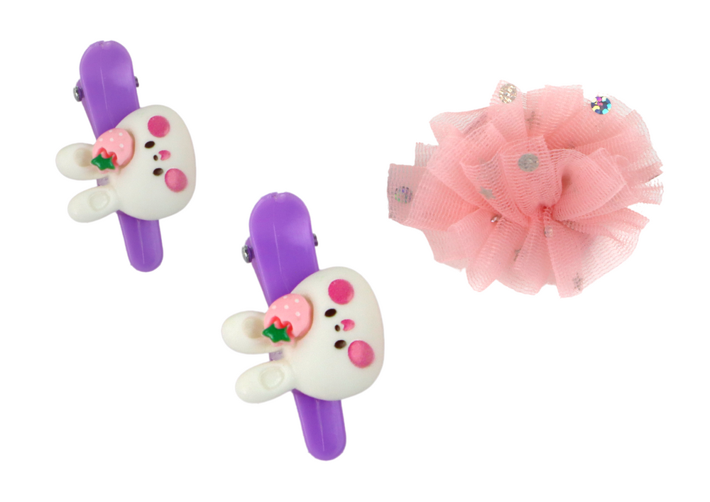 W zestawie znajdują się także dwie spineczki do włosów, których motywem przewodnim jest uroczy króliczek. Spinki są utrzymane w fioletowo-białej kolorystyce, co sprawia, że doskonale komponują się z resztą zestawu. Dodają one subtelności każdej fryzurze, a motyw króliczka nadaje im dziecięcego uroku.