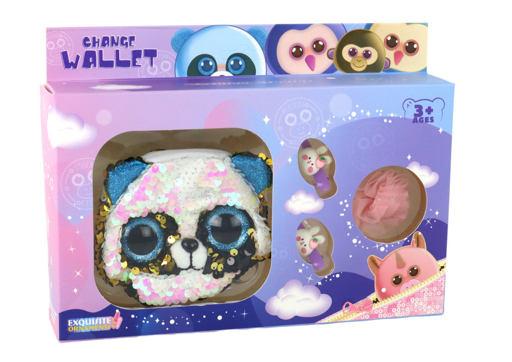 Zestaw dla dziewczynki to uroczy komplet, który z pewnością zachwyci małą damę swoim urokiem i delikatnością. Centralnym elementem zestawu jest portfelik w kształcie uroczej pandy. Wykonana jest z lśniących cekinów, które nadają mu magicznego blasku. Jego niebieskie oczka dodają uroku i dziewczęcego wdzięku.