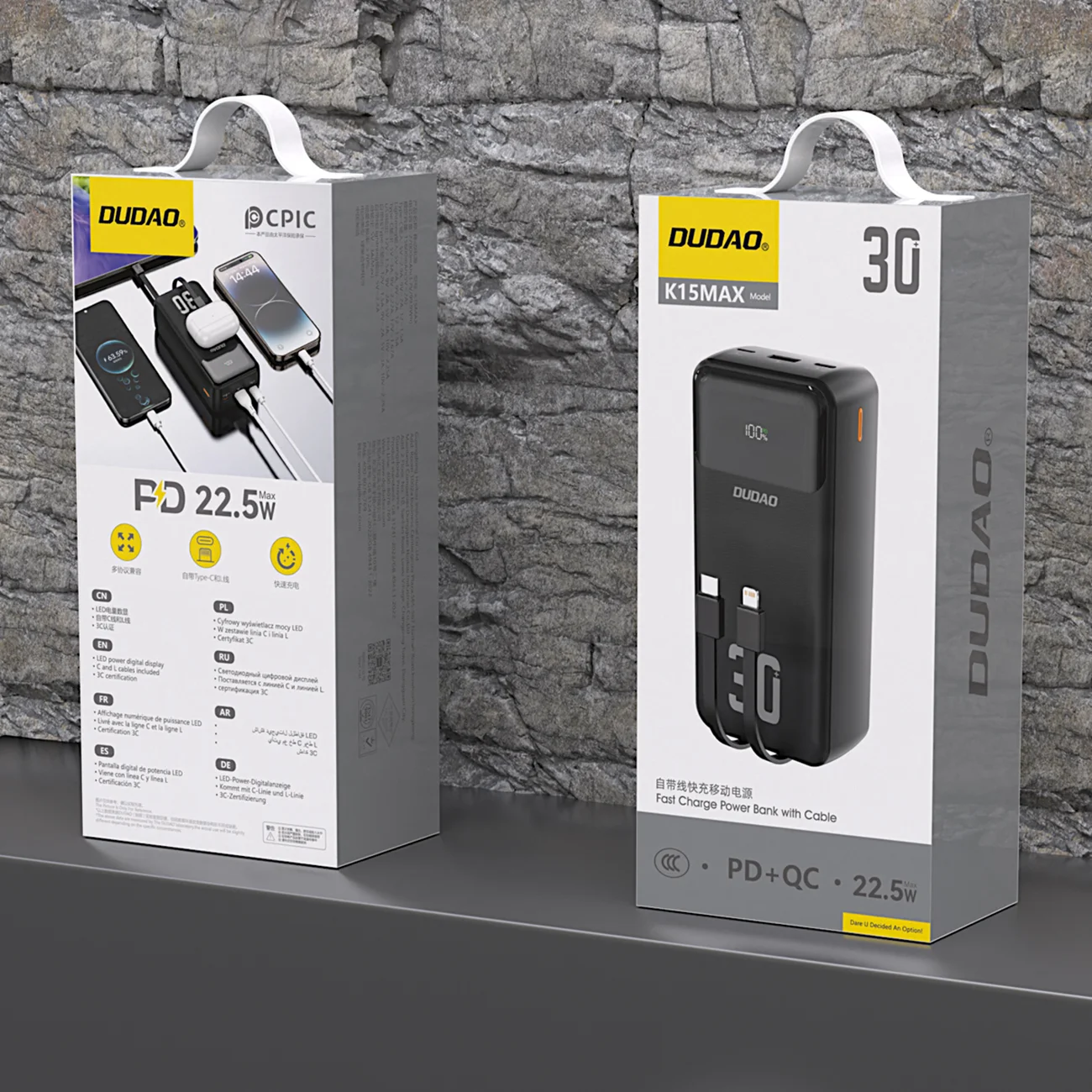 Powerbank Dudao K15MAX to niezawodne źródło energii, które zapewnia dużą pojemność 30000mAh. Dzięki temu możesz naładować swój smartfon wielokrotnie, co sprawia, że jest idealnym towarzyszem w podróży, biwaku czy pracy w terenie.