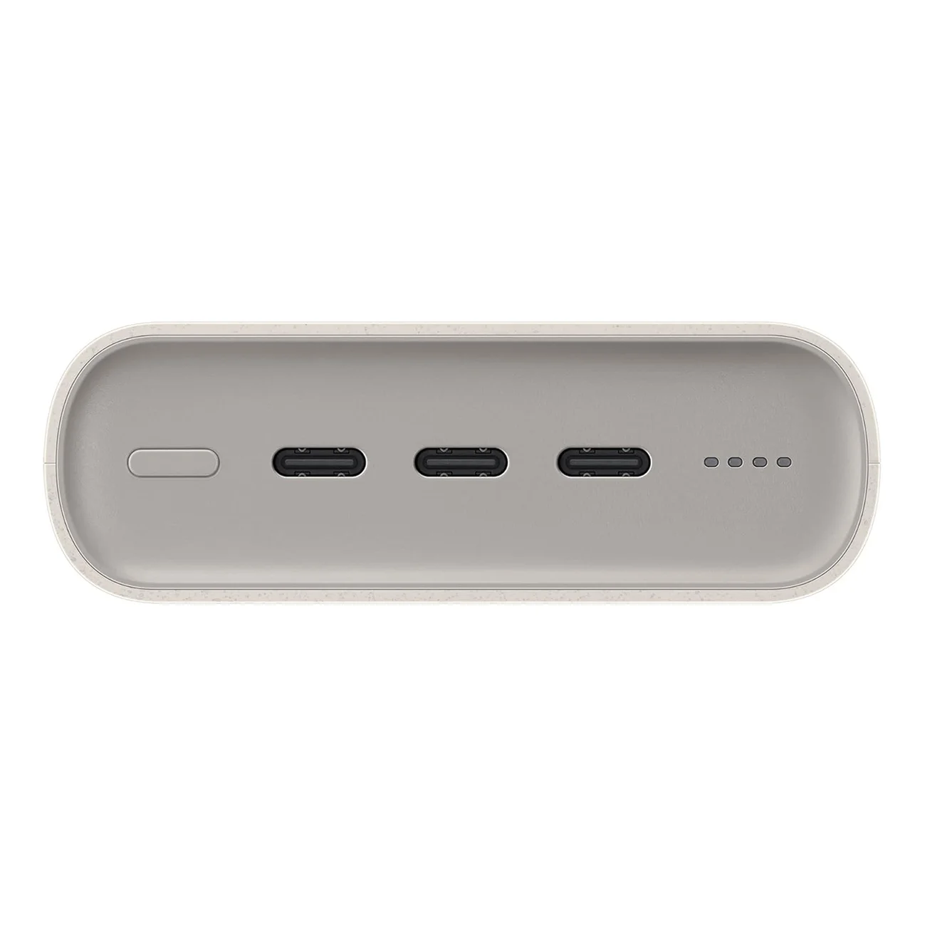 Wyposażony w trzy porty USB-C, powerbank umożliwia jednoczesne ładowanie trzech urządzeń, co jest doskonałym rozwiązaniem dla osób korzystających z wielu gadżetów.