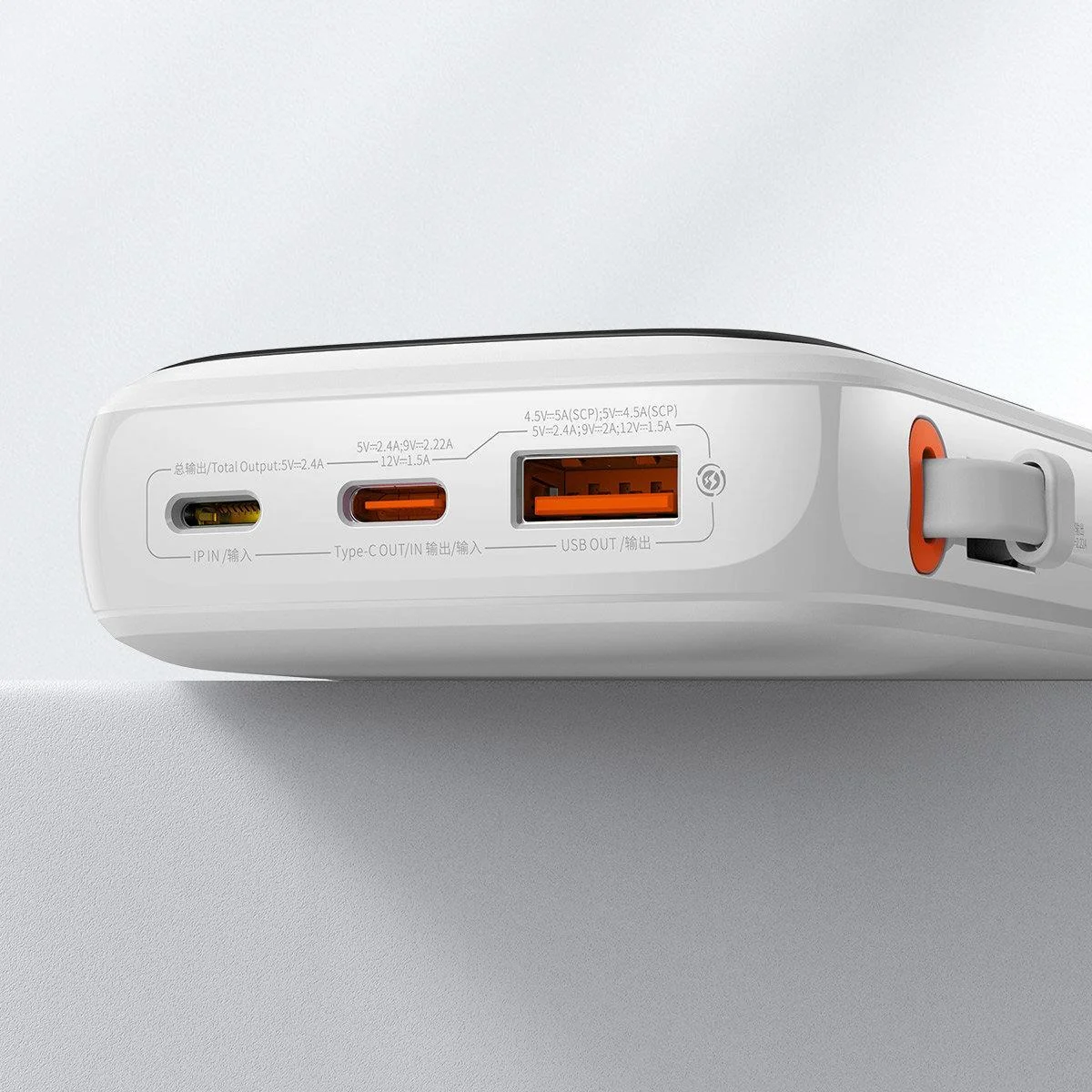 Odkryj mobilne źródło energii z powerbankiem marki Baseus. Dzięki pojemności 10000 mAh, możesz ładować do trzech urządzeń jednocześnie. Wbudowany kabel Lightning umożliwia natychmiastowe podłączenie telefonu i rozpoczęcie ładowania.