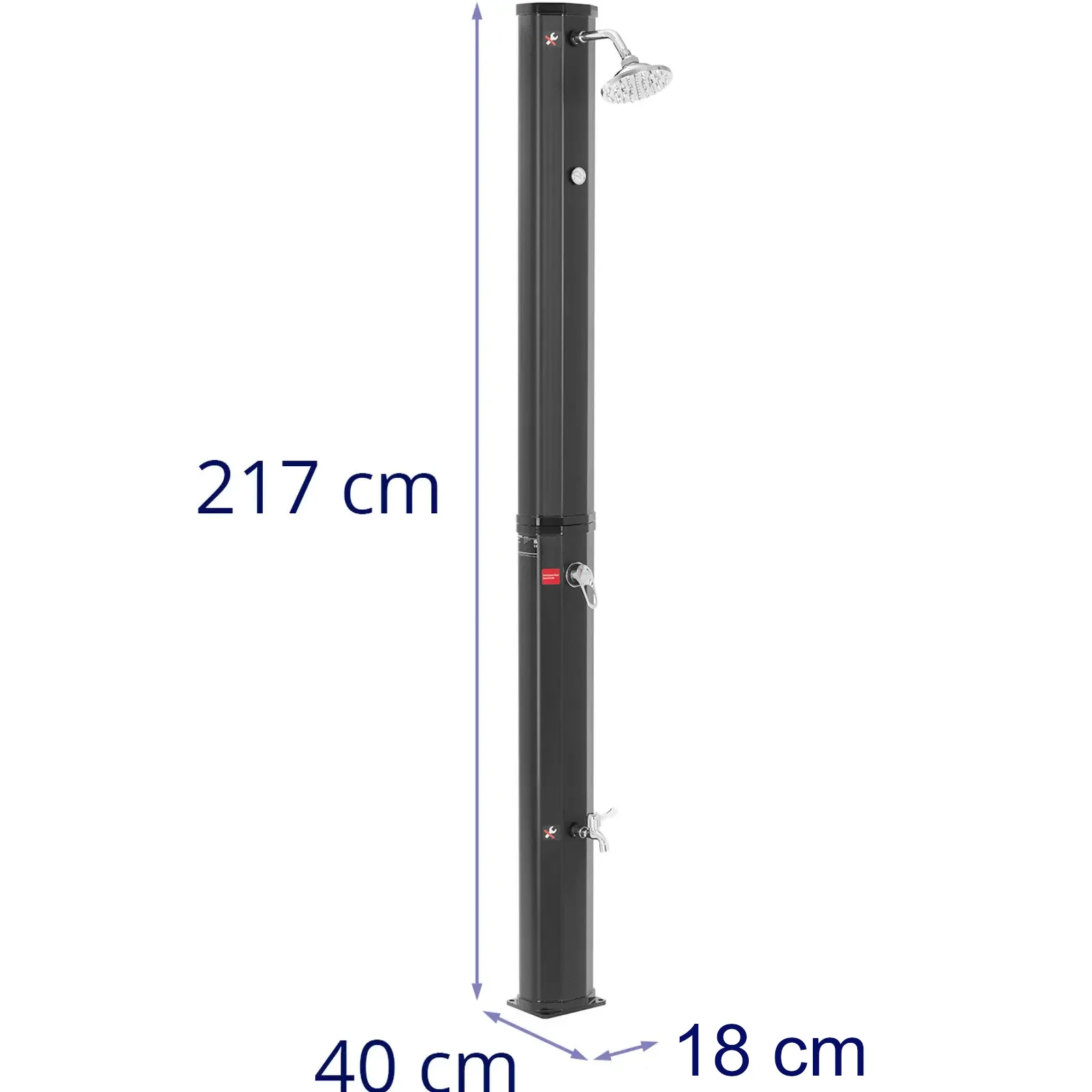 Montaż prysznica jest prosty i szybki dzięki dołączonym akcesoriom, a adapter do standardowych węży ogrodowych umożliwia łatwe podłączenie do systemu nawadniającego. Zaleca się umieszczenie prysznica w nasłonecznionym miejscu, aby maksymalnie wykorzystać energię słoneczną.