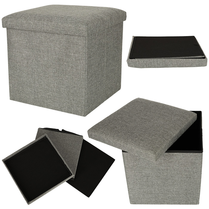 W schowku można przechowywać różne drobiazgi, kapcie czy koce, co pozwala na lepszą organizację przestrzeni w domu. Szary kolor pufy sprawia, że łatwo wkomponuje się w każde wnętrze – w korytarzu, salonie czy pokoju dziecięcym jako schowek na zabawki.