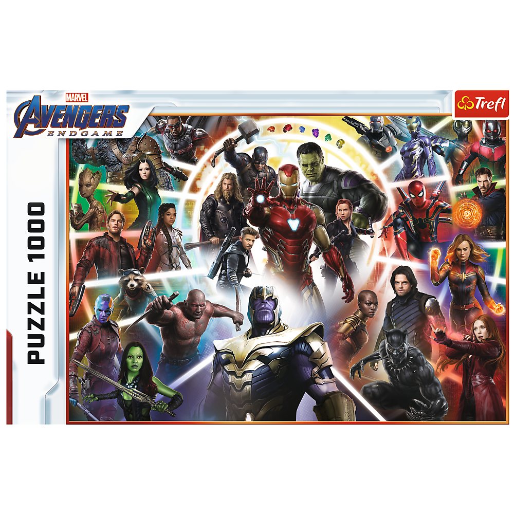 Puzzle 1000 - Avengers: Koniec GryZestaw składający się z 1000 elementów, przedstawia kultowych super bohaterów Marvela.Gotowe dzieło to obraz o rozmiarze 683x480mm Puzzle 1000el.Puzzle 1000 elementów i zostały stworzone z myślą o wszystkich miłośniczkach i miłośnikach układanek. Szukasz pomysłu na miły wieczór w domowym zaciszu? Układanie puzzli to świetny sposób na spędzenie wolnego czasu w gronie przyjaciół i rodziny a do tego rewelacyjny trening dla mózgu. Puzzle Trefl wytworzono w Polsce, przy użyciu wysokiej jakości materiałów podlegających recyclingowi. Zastosowanie specjalnego papieru o strukturze włókna lnu ogranicza odbicia światła i ułatwia układanie, dając jeszcze więcej radości.Podejmij wyzwanie i spędź czas na układaniu puzzli. Po ukończeniu układanki powstanie obrazek o wymiarach 683 x 480 mm. Precyzyjnie wykonane i idealnie dopasowane elementy oraz wysoka jakość nadruku sprawiają, że układanie jest łatwe i przyjemne, a sam obrazek po sklejeniu specjalnym klejem do puzzli Trefl może pięknie prezentować się na ścianie. Układanka została zapakowana w solidne, tekturowe pudełko, które zabezpieczy elementy przed zgubieniem. Świetnym uzupełnieniem zestawu puzzli może być mata do układania i przechowywania nieukończonych układanek marki Trefl.Układanie puzzli, to twórcza i rozwijająca aktywność!Układanie puzzli jest doskonałym treningiem pamięci i koncentracji. Uczy cierpliwości i wytrwałości, a także pomaga się wyciszyć. Poznaj relaksujące hobby dla każdego!Puzzle 1000 el. to wyjątkowy prezent dla dorosłych i dzieci powyżej 12. roku życia.Szeroki wybór puzzli Trefl pozwala wybrać układankę idealnie dopasowaną do Twoich zainteresowań. Puzzle są doskonałym prezentem z okazji urodzin lub świąt.• Zawartość pudełka:Puzzle 1000el. • Wymiary opakowania: 400x270x60mm• Wymiary ułożonych puzzli: 683x480mm• Przeznaczone dla dzieci powyżej 12 roku życia i dorosłych.