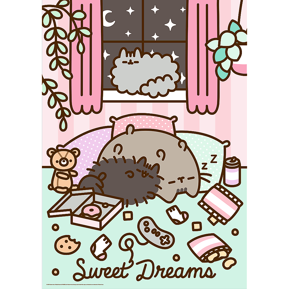 Puzzle Pusheen przedstawiają tytułowego bohatera słodko śpiącego. Po ich ułożeniu powstanie obraz o wymiarach 683x480 mm.