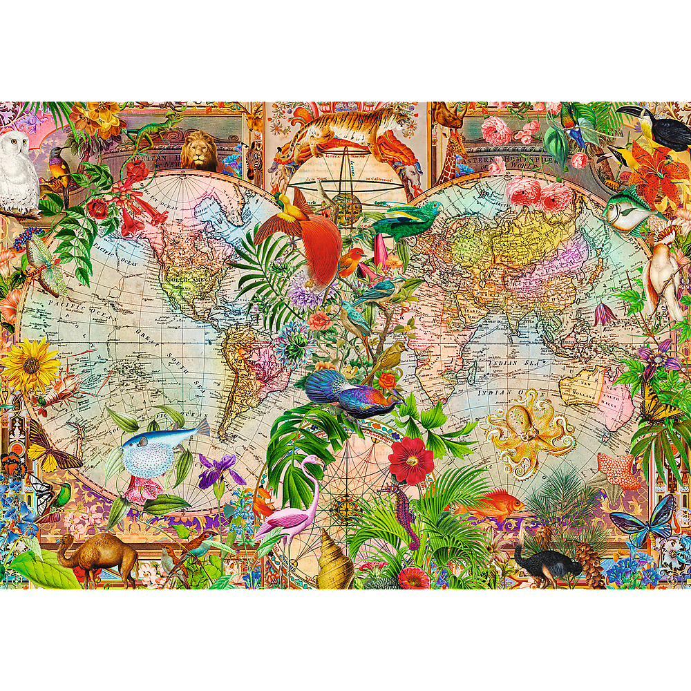 Puzzle Antyczna mapa świata przedstawiają starodawną mapę ozdobioną motywami fauny i flory. Po ich ułożeniu powstanie obraz o wymiarach 683x480 mm.