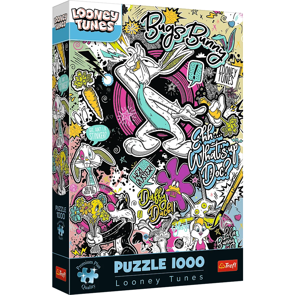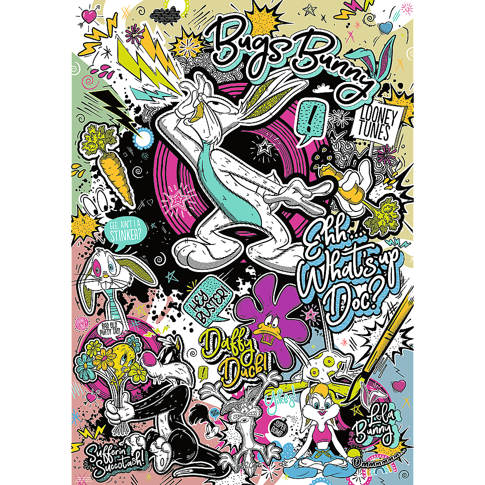 Puzzle Looney Tunes przedstawiają szaloną grafikę z bohaterami bajki Zwariowane melodie. Po ich ułożeniu powstanie obraz o wymiarach 683x480 mm.