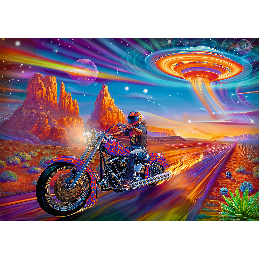 Puzzle DreamScapes: Szalona jazda, składające się z 1000 elementów, przedstawiają motocyklistę pędzącego przez pustynną autostradę, nad którą wznosi się statek kosmiczny. Po ich ułożeniu powstanie obrazek w rozmiarach 683x480 mm.