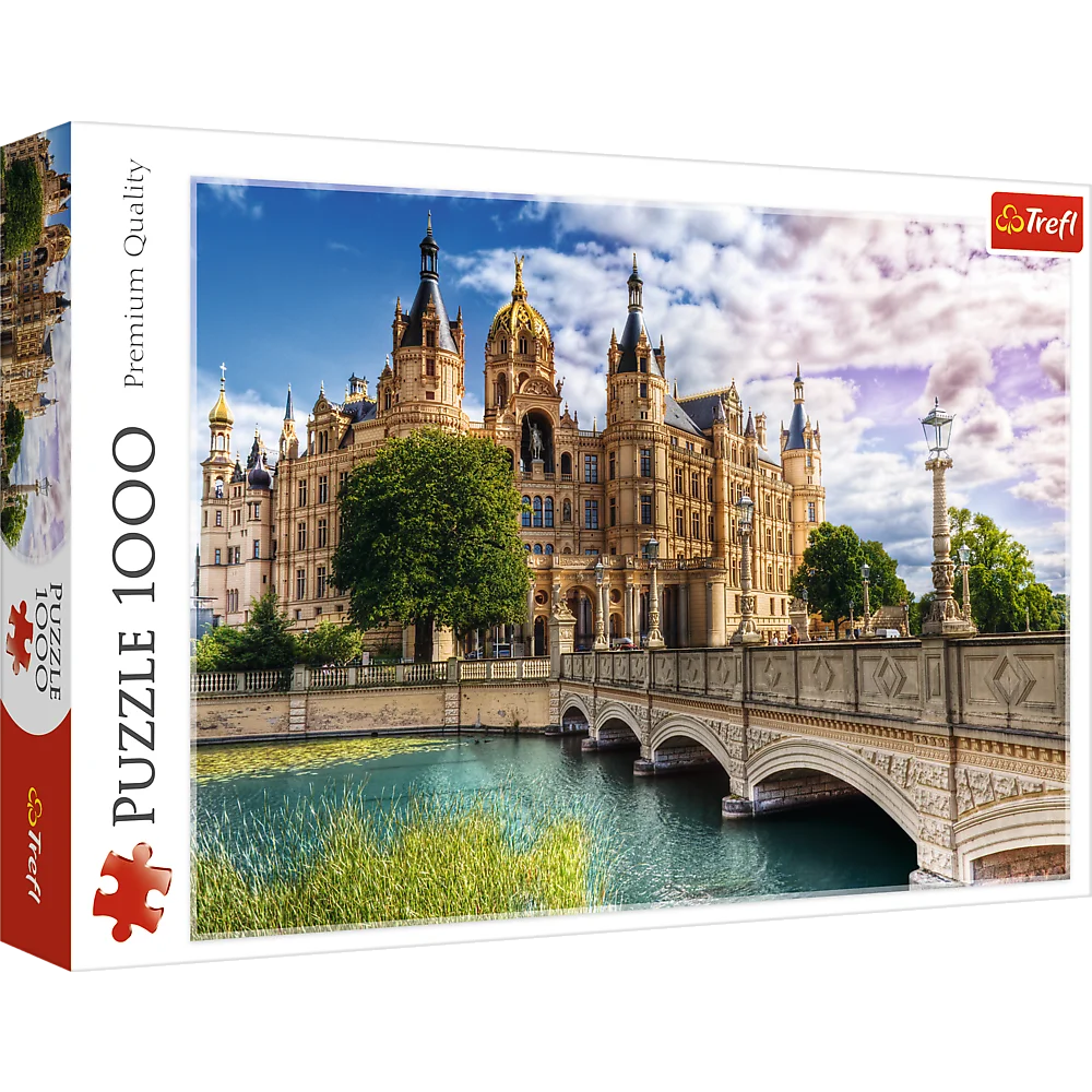 Puzzle składające się z 1000 elementów przedstawiające zamek na wyspie. Po ułożeniu powstanie obrazek o wymiarach 683x480 mm.