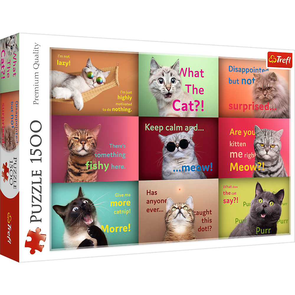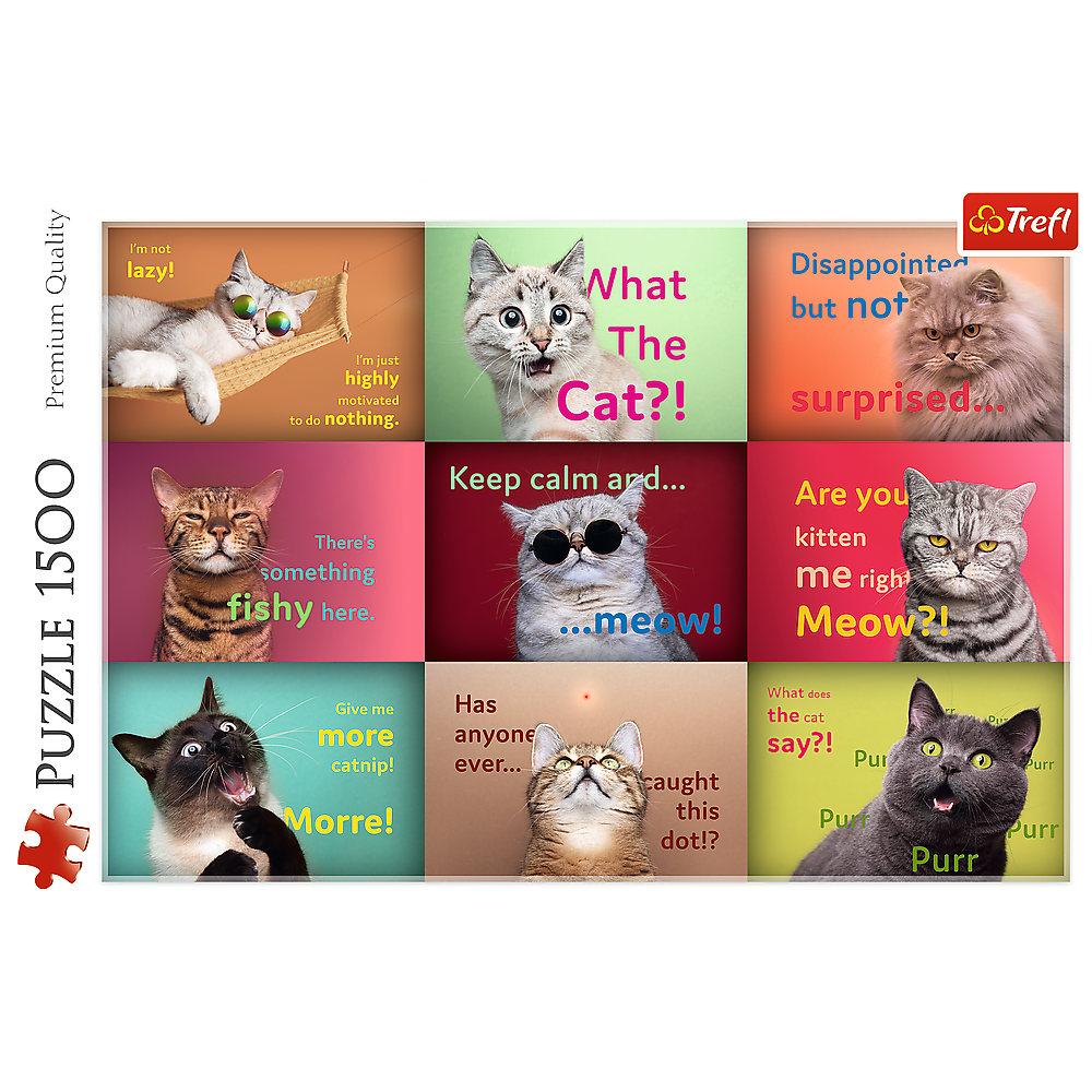 Puzzle Zabawne kocie portrety składają się z 1500 elementów i przedstawiają śmieszne memy z kotami w rolach głównych. Po ich ułożeniu powstanie obrazek o wymiarach 850x580 mm.