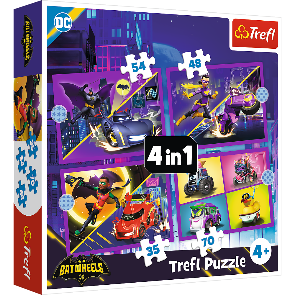 Poznaj Batwheels to 4 niezależne układanki dla dzieci, zaprojektowane z myślą o małych fanach przygód bohaterów serialu o kultowych pojazdach z uniwersum DC. Po ułożeniu puzzli powstaną 4 obrazki, z czego największy o wymiarach 285x205 mm. Zróżnicowana liczba elementów pozwala na zabawę zarówno młodszym, jak i nieco starszym dzieciom.
