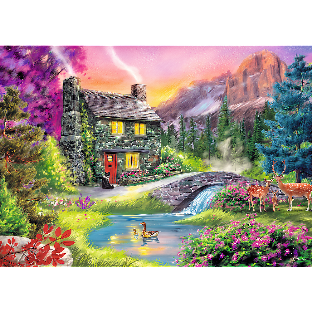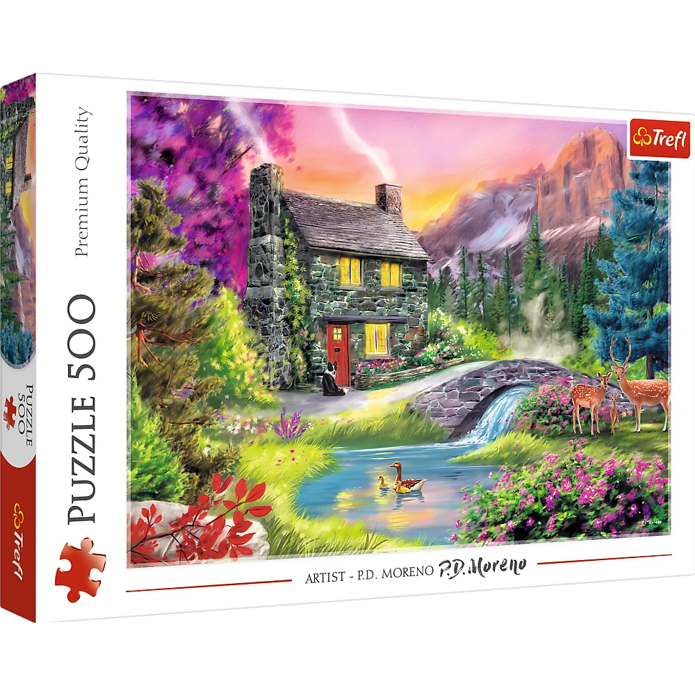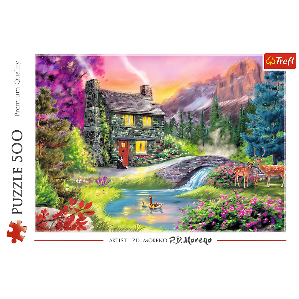 Puzzle "Górska Sielanka" od firmy Trefl to zestaw 500 elementów, który przeniesie Cię w magiczny, malowniczy świat górskiej przyrody. Obraz autorstwa P.D. Moreno przedstawia urokliwy kamienny domek otoczony kwitnącym ogrodem, spokojnym jeziorem oraz dzikimi zwierzętami. Żywe kolory i wyjątkowa dbałość o szczegóły sprawiają, że układanie tych puzzli to czysta przyjemność i relaks. Idealny wybór dla miłośników natury i spokojnych wieczorów z puzzlami.