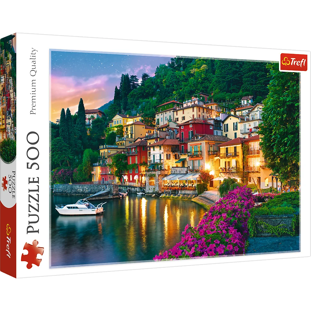 Puzzle 500 elementów z pięknym widokiem na Jezioro Como we Włoszech. Po ułożeniu powstanie obrazek o wymiarach 48x34 cm. Wysoką jakość, nasycenie kolorów i bezpieczeństwo układania zapewnia kalandrowany papier odbijający światło, pokryty ekologicznymi farbami spożywczymi.