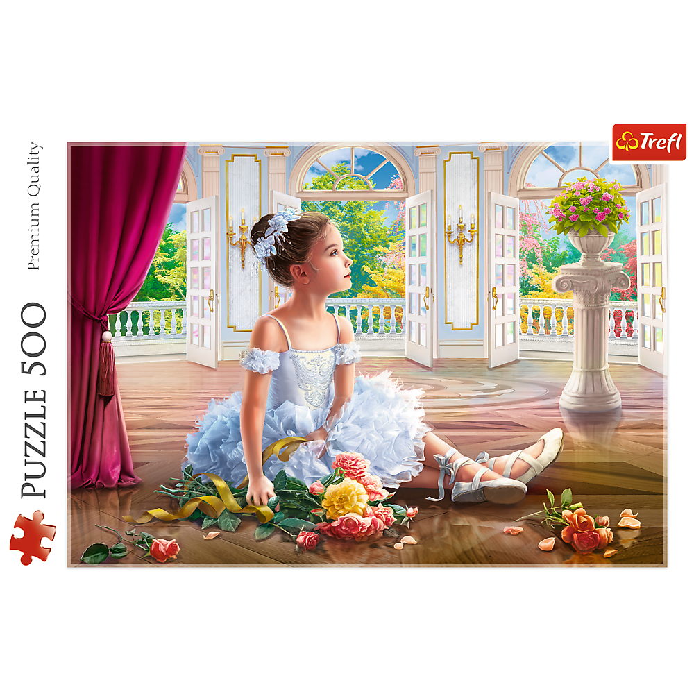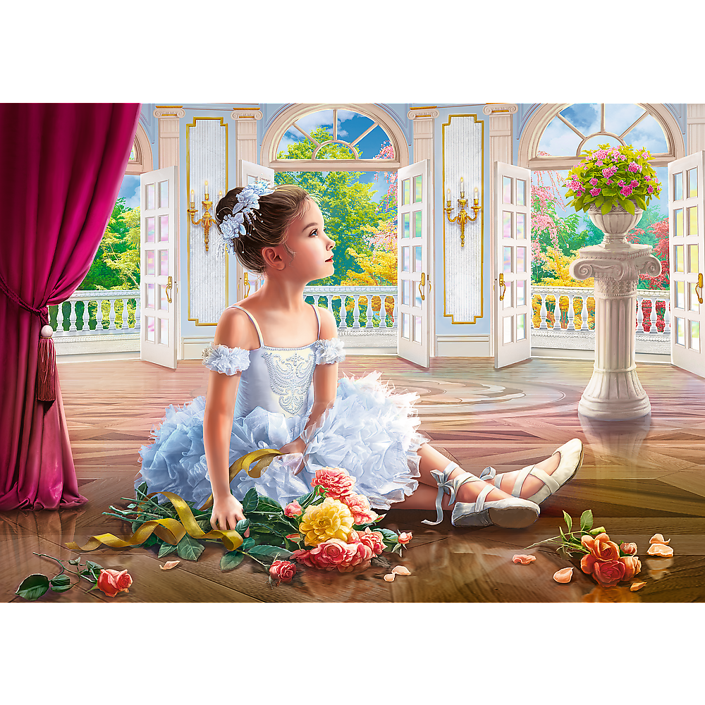 Puzzle 500 elementów przedstawiające małą baletnicę siedzącą na parkiecie wśród kwiatów. Po ułożeniu powstanie obrazek o wymiarach 48x34 cm. Wysoką jakość, nasycenie kolorów i bezpieczeństwo układania zapewnia kalandrowany papier odbijający światło, pokryty ekologicznymi farbami spożywczymi.