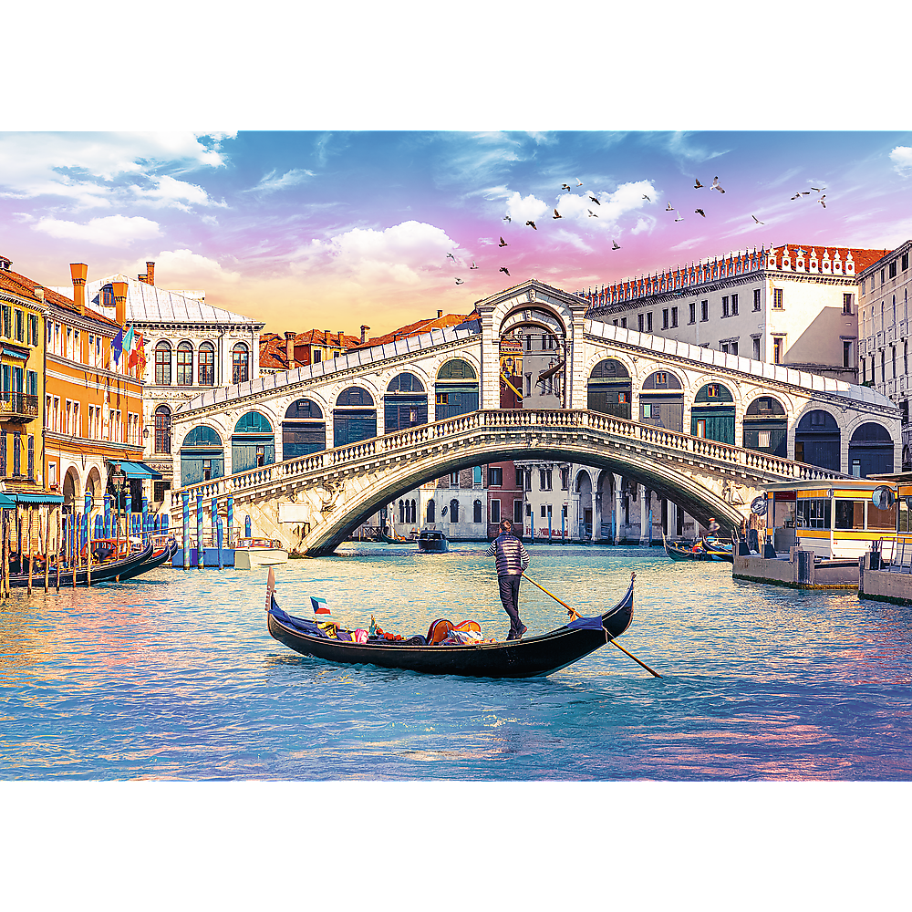 Puzzle 500 elementów przedstawiające Most Rialto we włoskim mieście, Wenecji. Po ułożeniu powstanie obrazek o wymiarach 48x34 cm. Wysoką jakość, nasycenie kolorów i bezpieczeństwo układania zapewnia kalandrowany papier odbijający światło, pokryty ekologicznymi farbami spożywczymi.