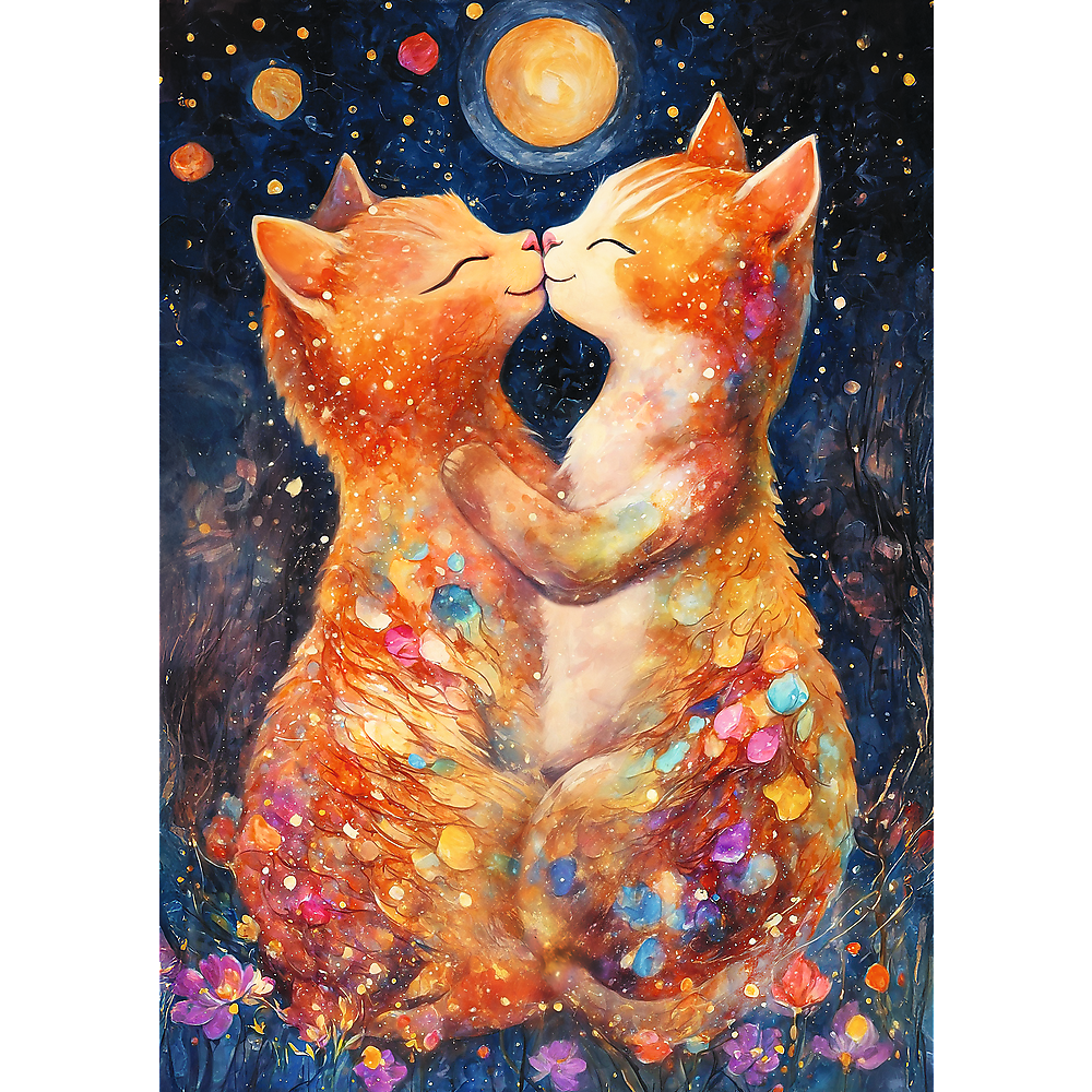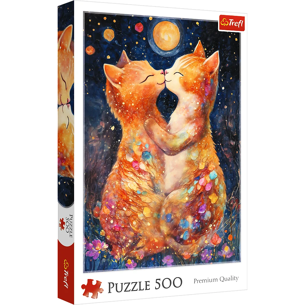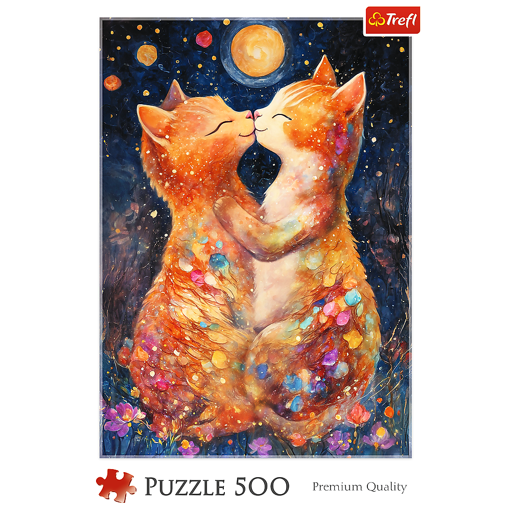 Puzzle Pocałunek w świetle księżyca składają się z 500 elementów i przedtawiają dwa całujące się kotki. Gotowa układanka ma wymiary 480x340 mm.