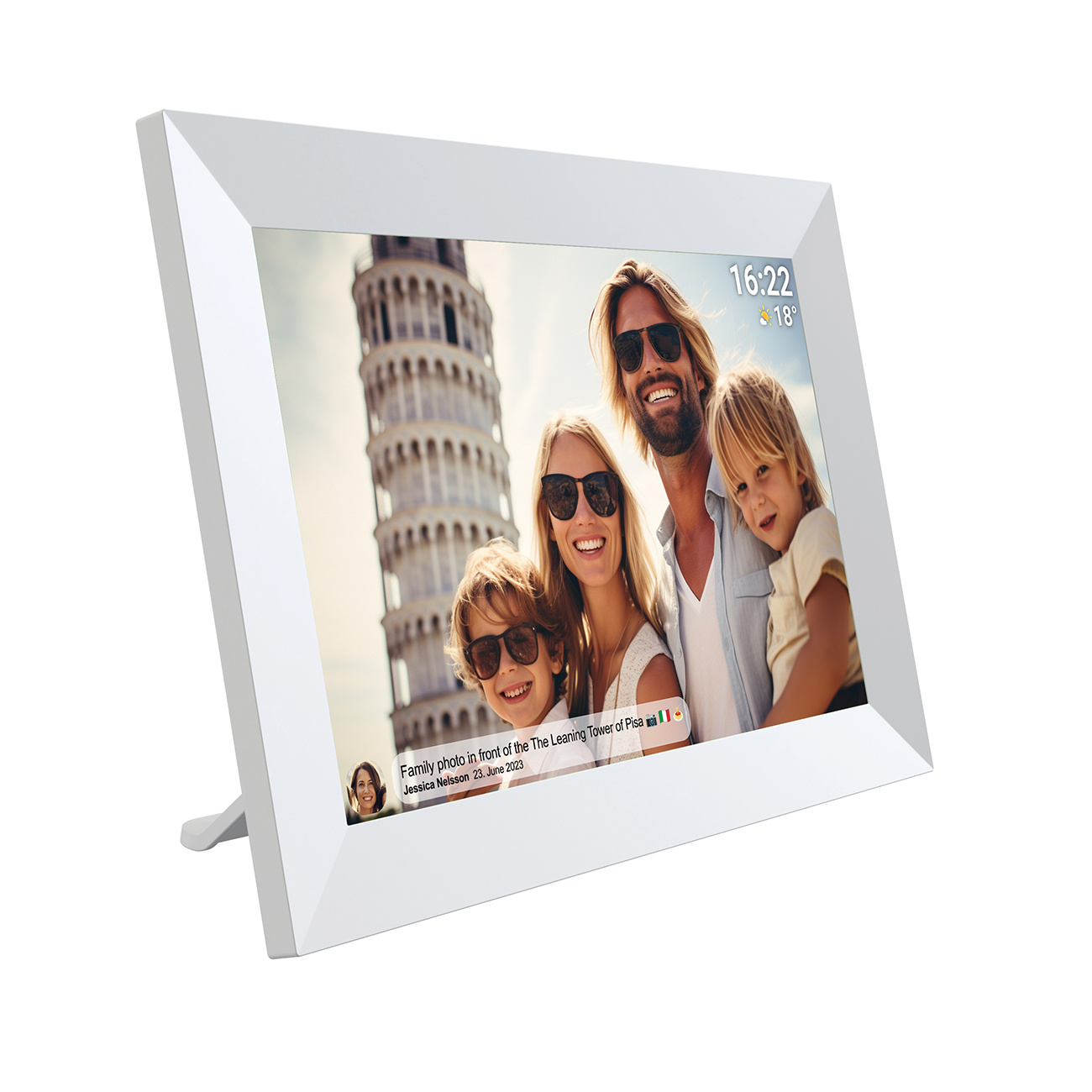 Ramka dysponuje 16 GB pamięci wewnętrznej oraz slotem na kartę microSD, co pozwala na przechowywanie setek zdjęć. Łączność Wi-Fi (2.4 i 5 GHz) umożliwia łatwe przesyłanie zdjęć oraz filmów z aplikacji Frameo. Interaktywny interfejs dotykowy pozwala na pełną personalizację wyświetlania, w tym efekty przejścia i czas wyświetlania zdjęć.