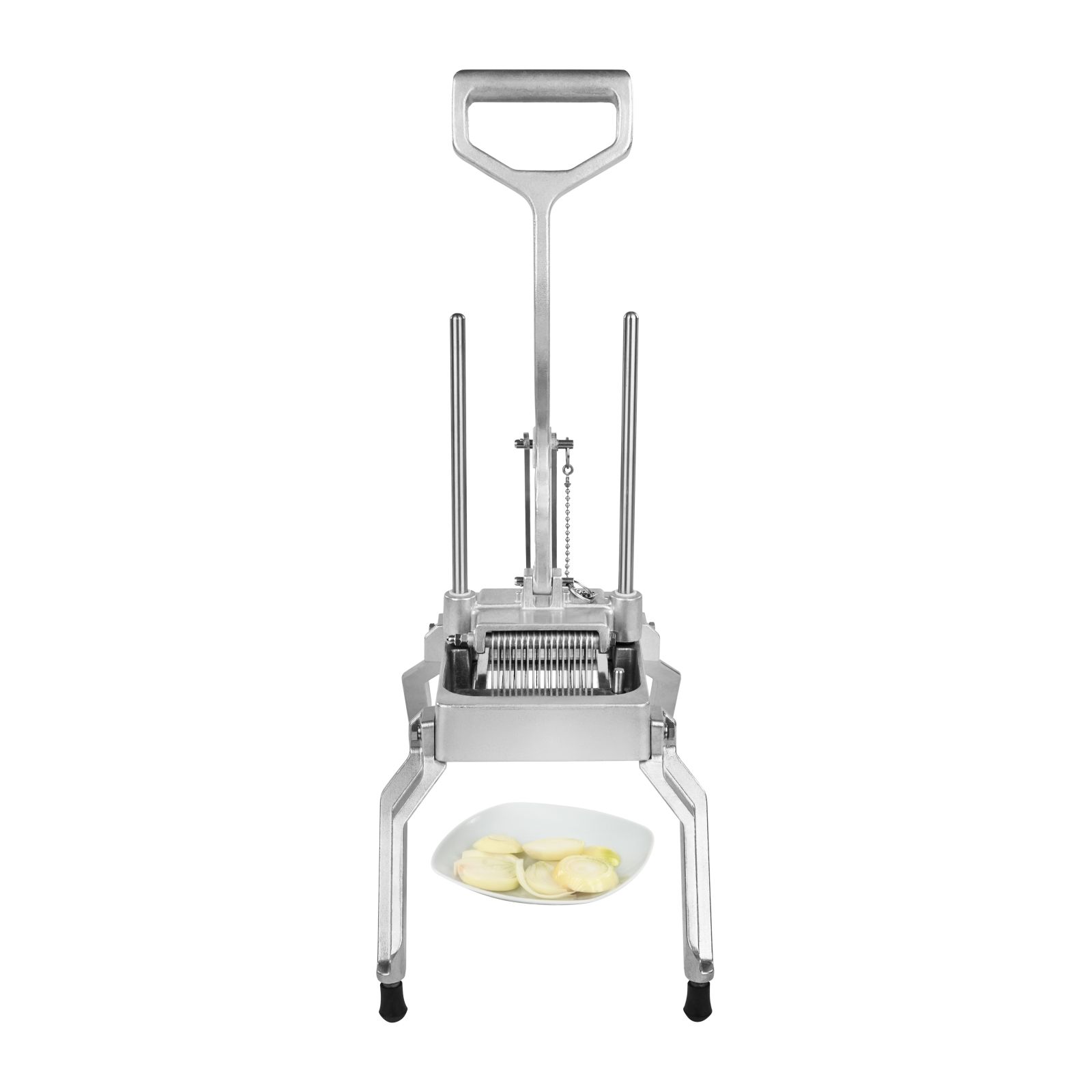 Ta profesjonalna krajalnica to doskonałe narzędzie do szybkiego krojenia owoców i warzyw. Wykonana w całości ze stali nierdzewnej, zapewnia trwałość i wygodę użytkowania. Dzięki niej możesz uzyskać równe plasterki o grubości 4,5 mm lub 9 mm, co znacznie przyspiesza przygotowanie potraw.