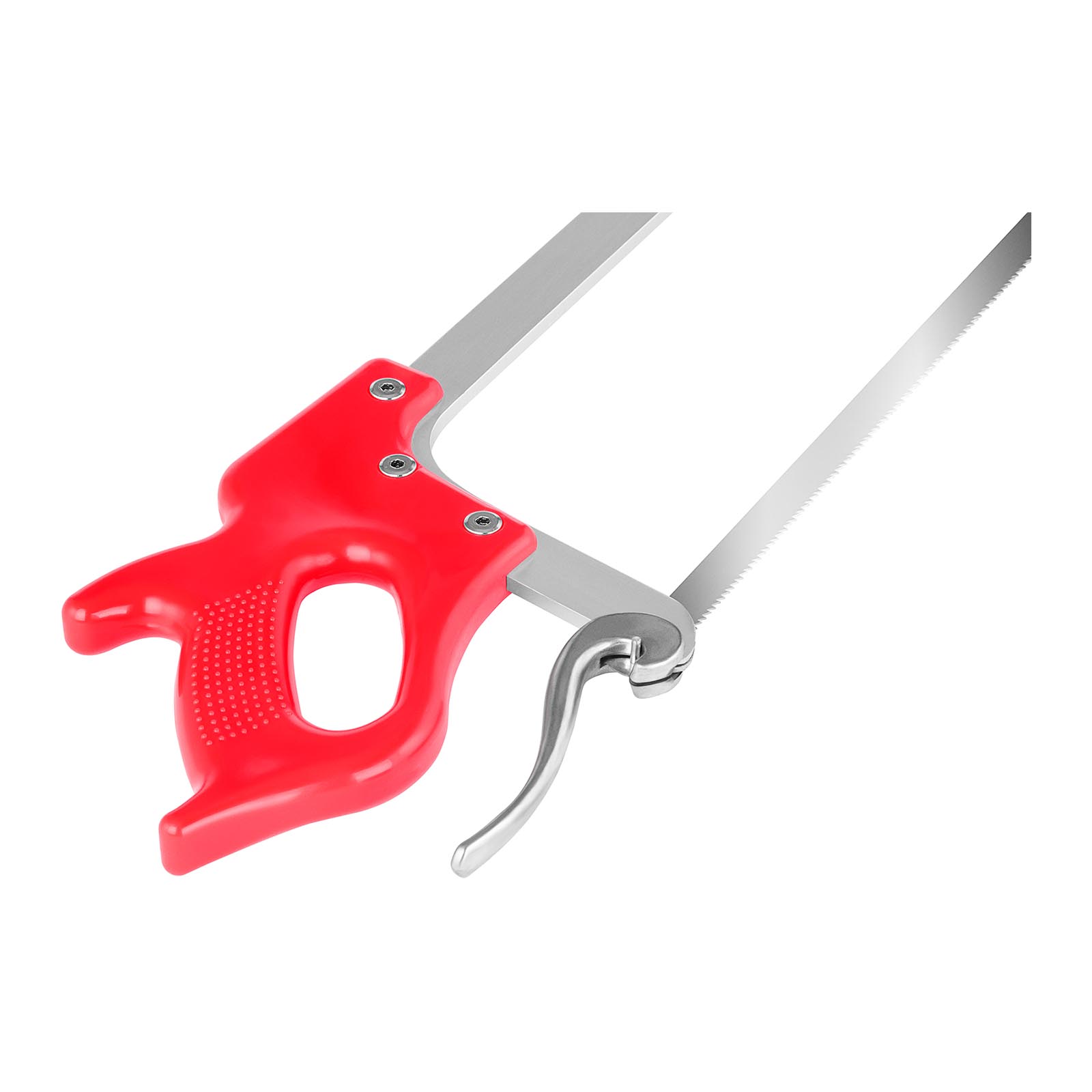 Profesjonalna ręczna piła do kości to idealne narzędzie dla każdego, kto ceni sobie efektywność i wygodę podczas pracy. Dzięki długiemu brzeszczotowi o długości 46 cm oraz ostrym zębom, cięcie zarówno świeżych, jak i zamrożonych produktów staje się proste i szybkie.