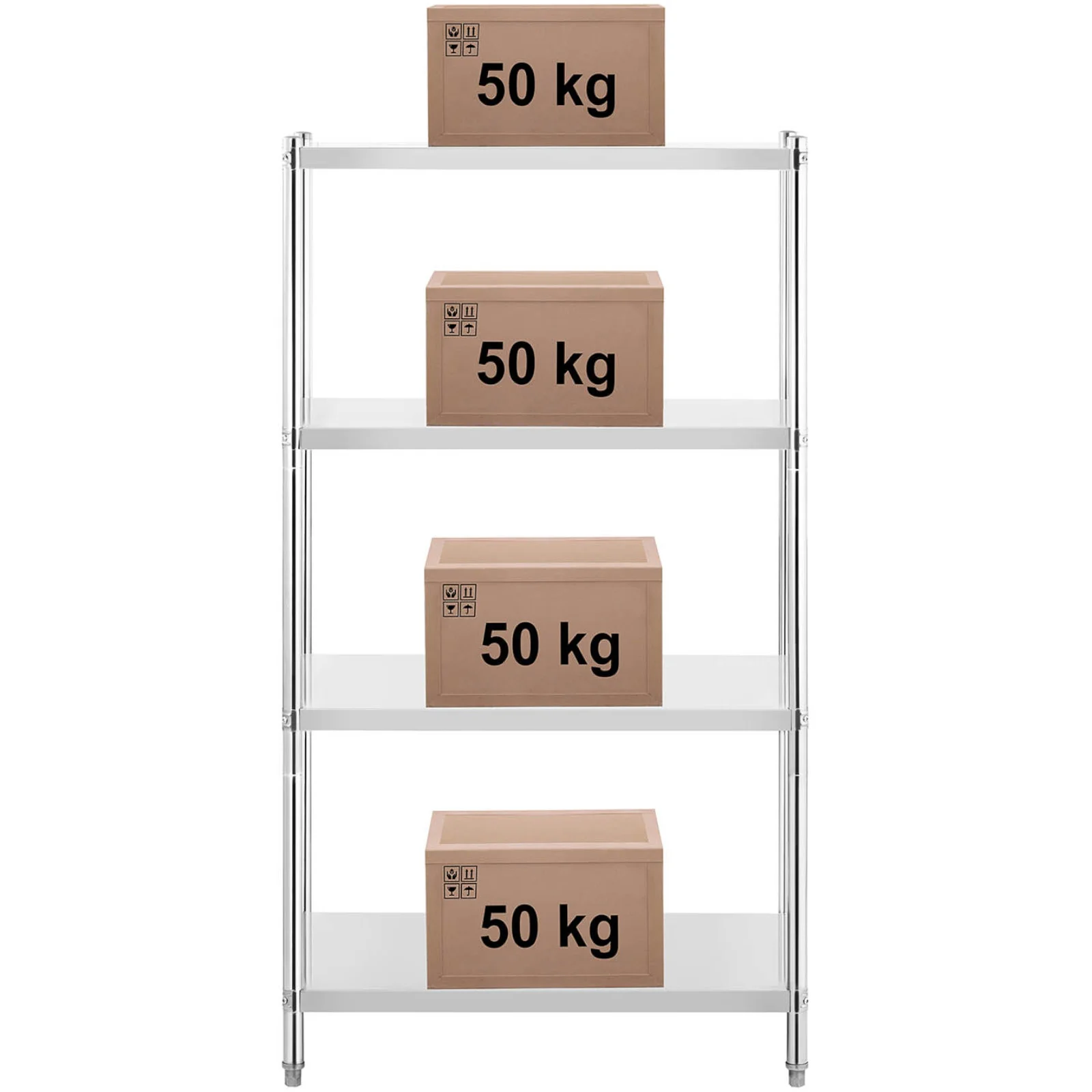 Na czterech półkach można przechowywać różnorodne akcesoria. Stabilna konstrukcja regału jest łatwa do utrzymania w czystości i spełnia standardy gastronomiczne, co pozwala na bezpieczne przechowywanie żywności. Srebrny kolor nadaje mu elegancki wygląd, przez co doskonale sprawdzi się w restauracjach, hotelach oraz w przestrzeniach prywatnych.