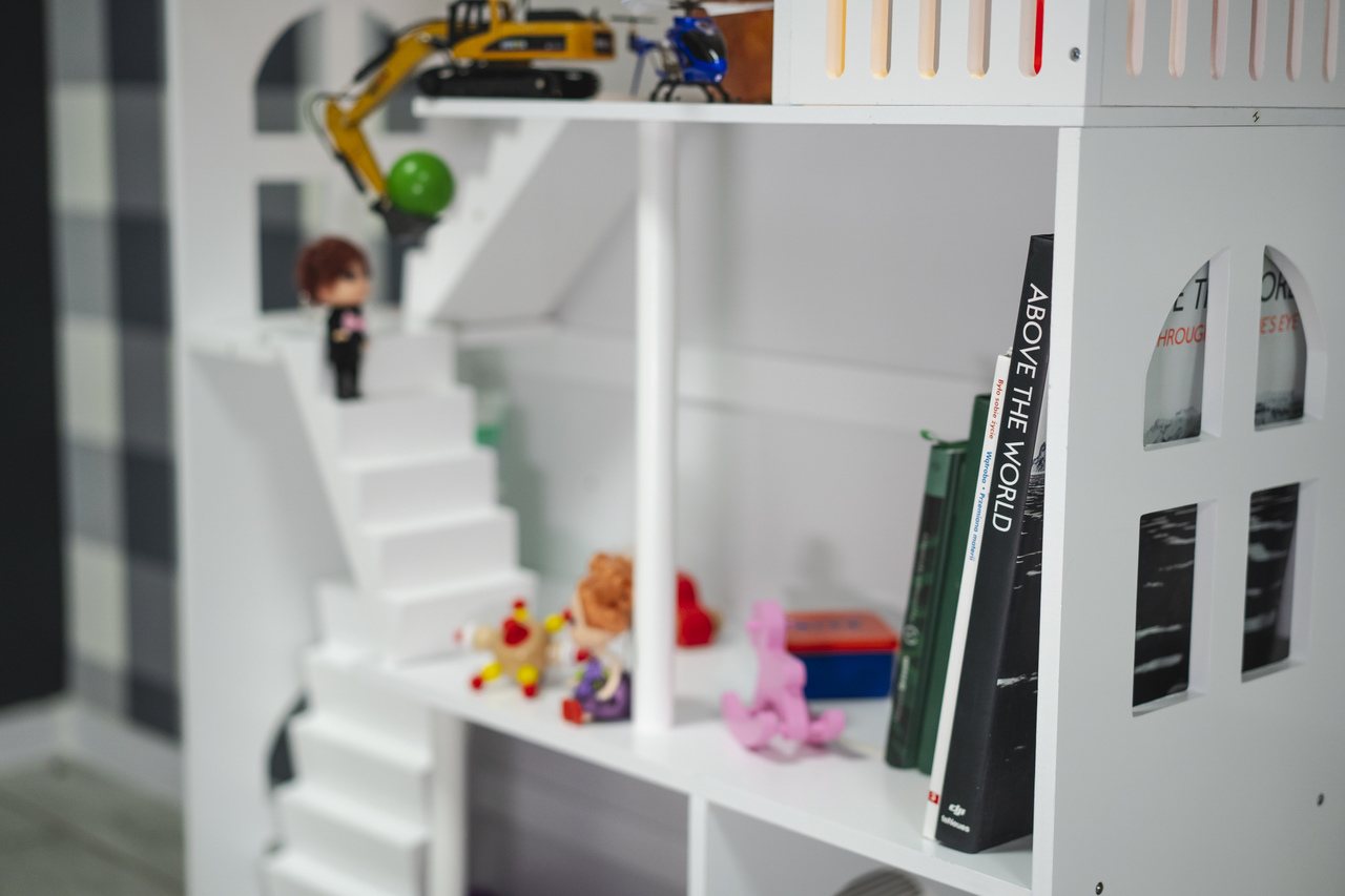 Książki, zabawki i szkatułki potrzebują nowego miejsca? Oferujemy duży, piękny regał w kształcie domku, który idealnie wpasuje się do dziecięcego pokoju. To praktyczny mebel, który doda uroku każdemu wnętrzu!