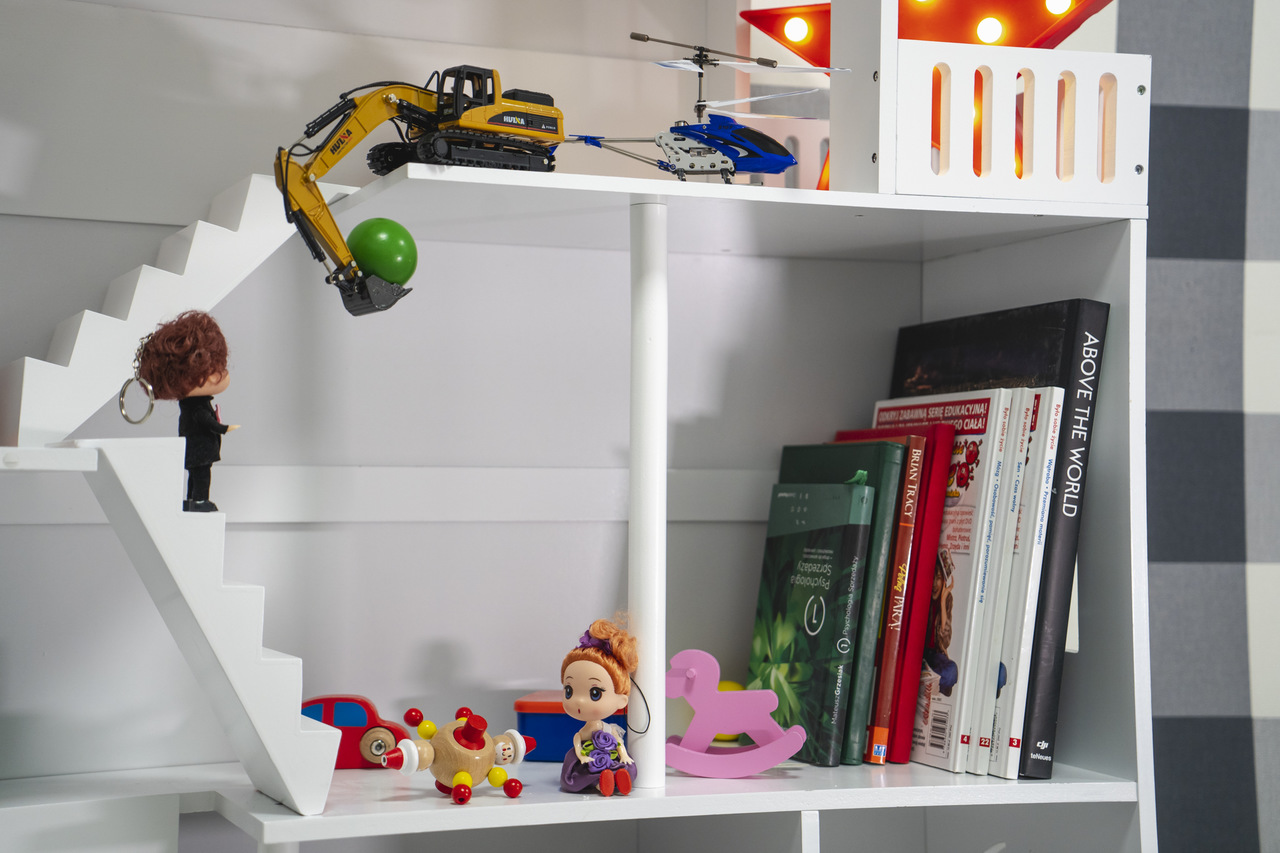 Regał może być wykorzystywany nie tylko do przechowywania książek, ale także jako domek dla lalek w trakcie zabawy. Pojemne półki pomogą rozwijać pasję do czytania, a dziecko z łatwością dosięgnie nawet najwyższych półek, co eliminuje potrzebę wspinania się na krzesła.