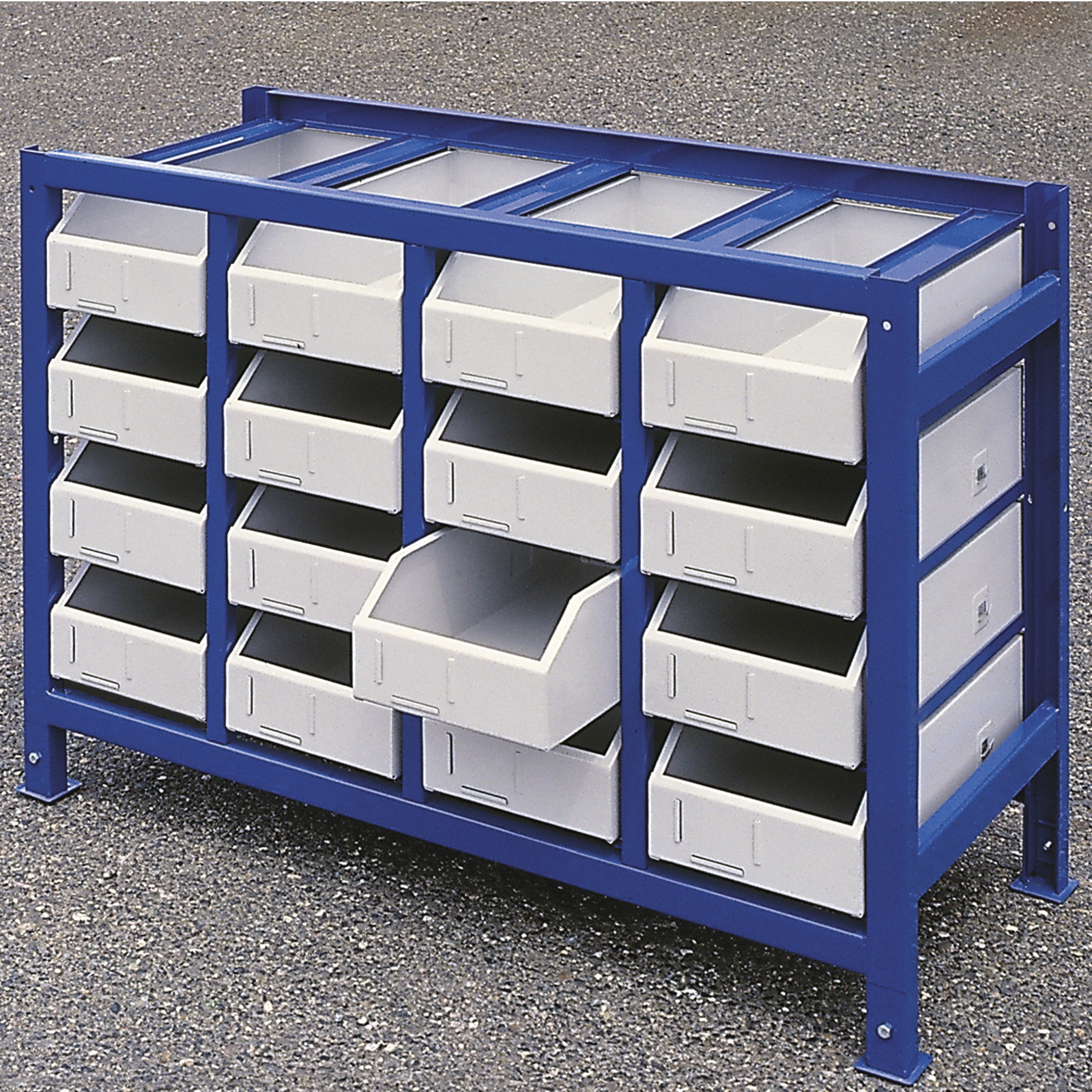 W zestawie znajduje się spawany regał stalowy MEVA 6712 oraz 16 szuflad o nośności 50 kg każda.