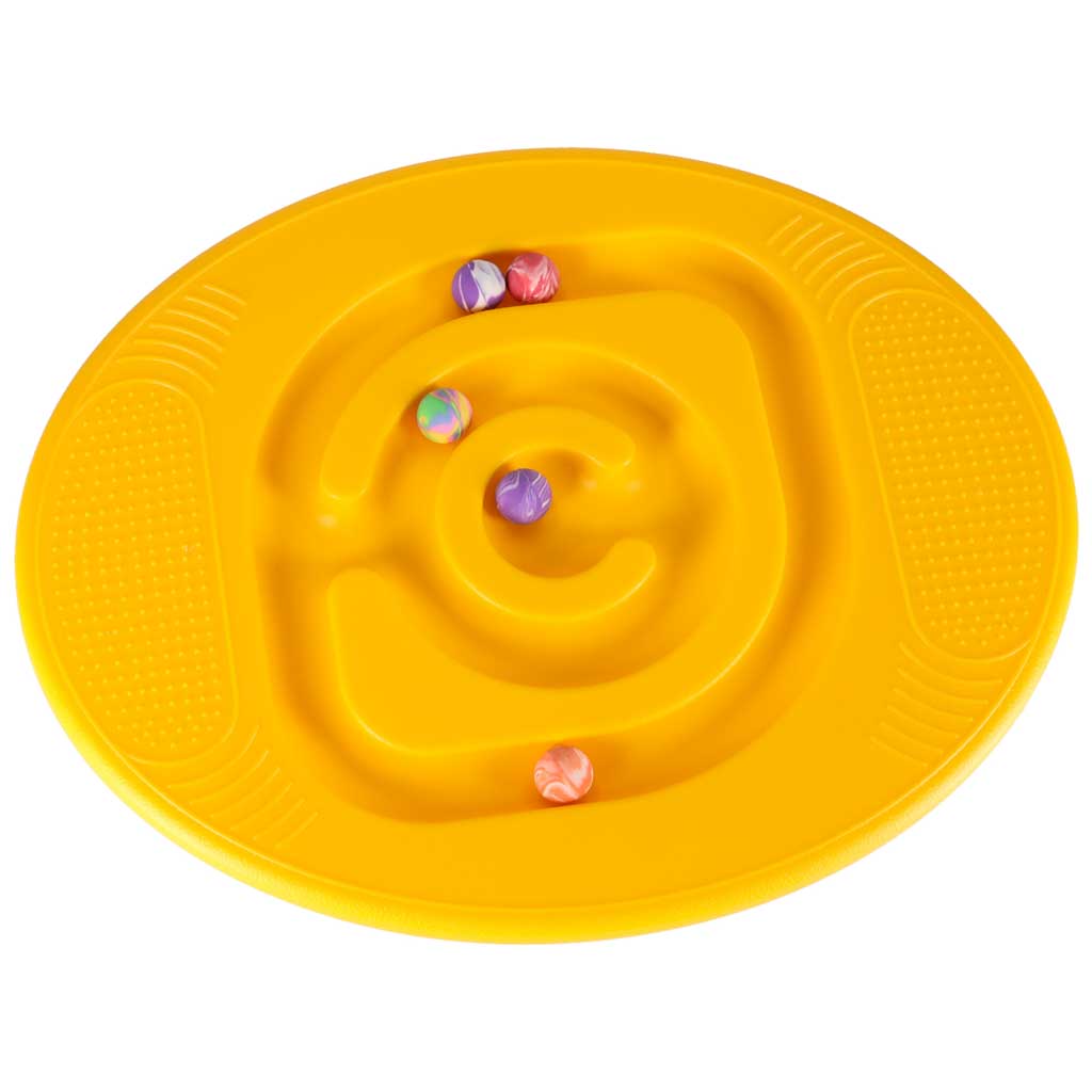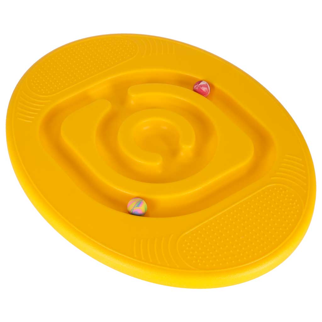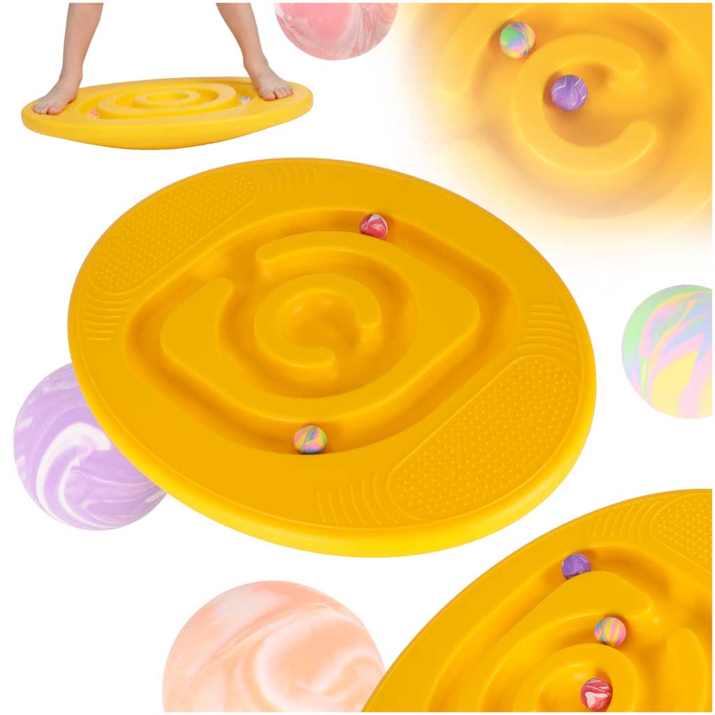 Równoważnia wykonana jest z trwałego plastiku w żółtym kolorze, co zapewnia długotrwałą zabawę. Labirynt umieszczony w centrum deski angażuje dzieci, a wypukłości na powierzchni wspierają ich bezpieczeństwo.