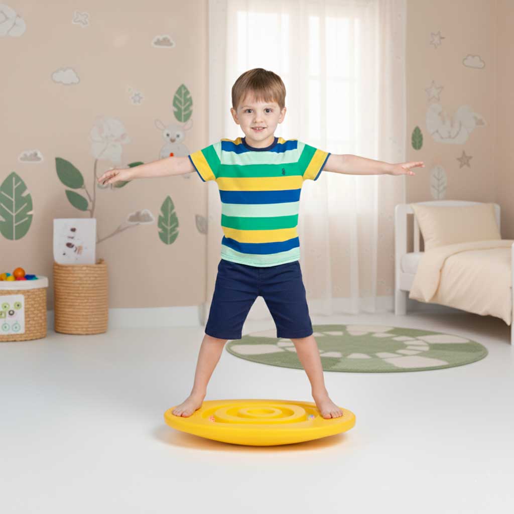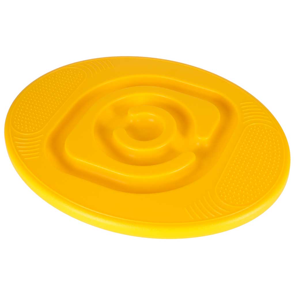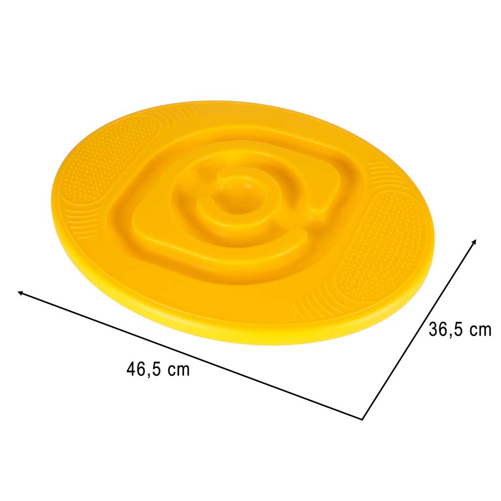 Równoważnia wykonana jest z trwałego plastiku w żółtym kolorze, co zapewnia długotrwałą zabawę. Labirynt umieszczony w centrum deski angażuje dzieci, a wypukłości na powierzchni wspierają ich bezpieczeństwo.
